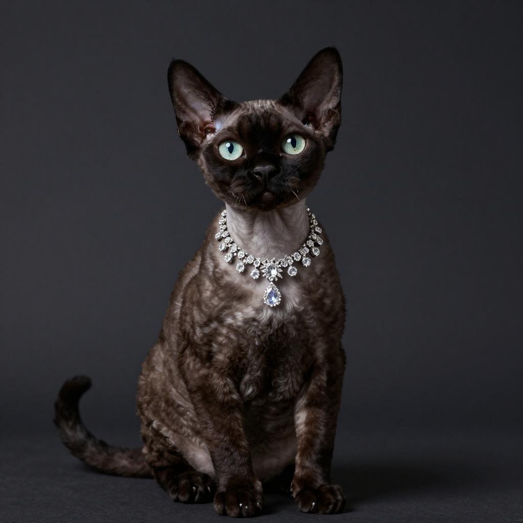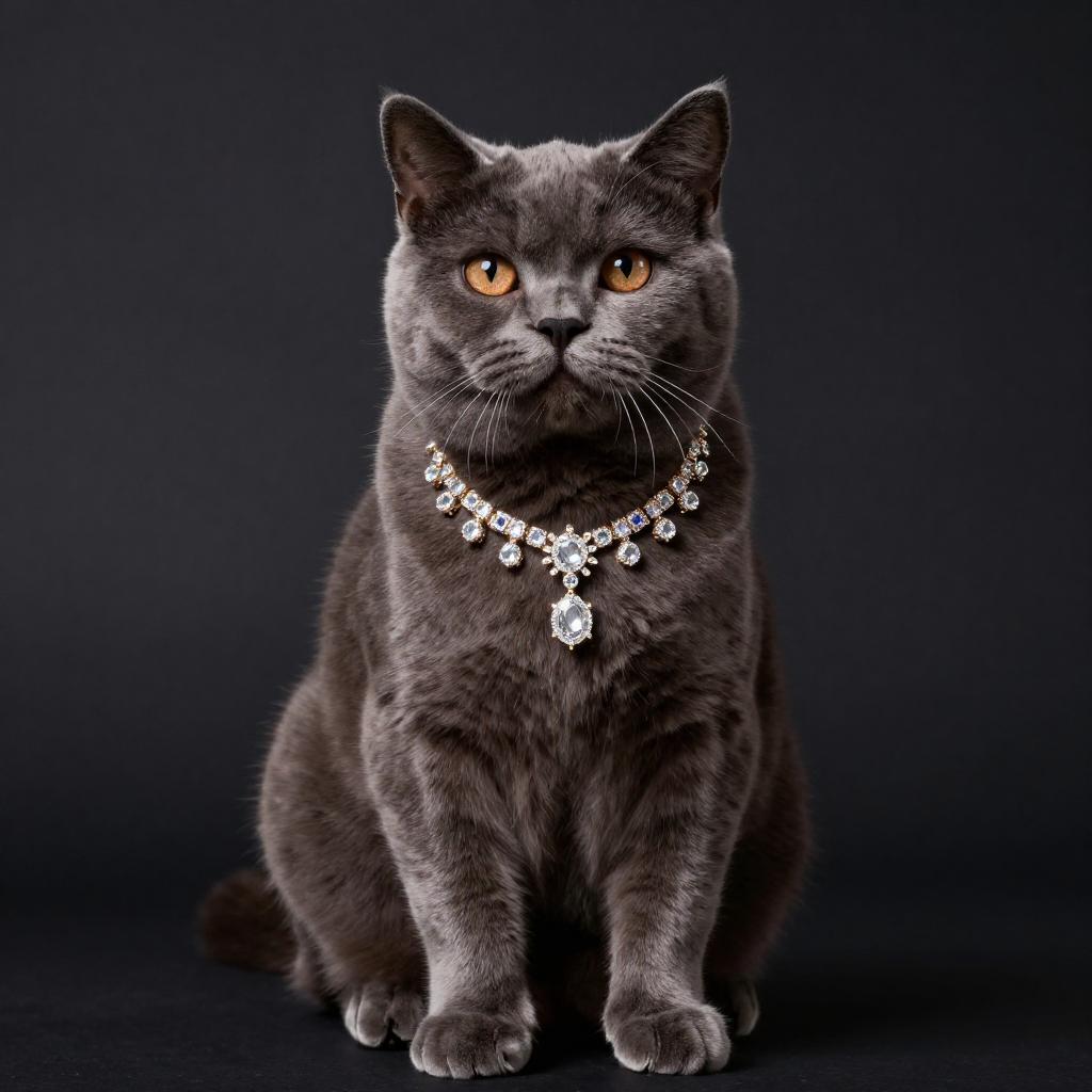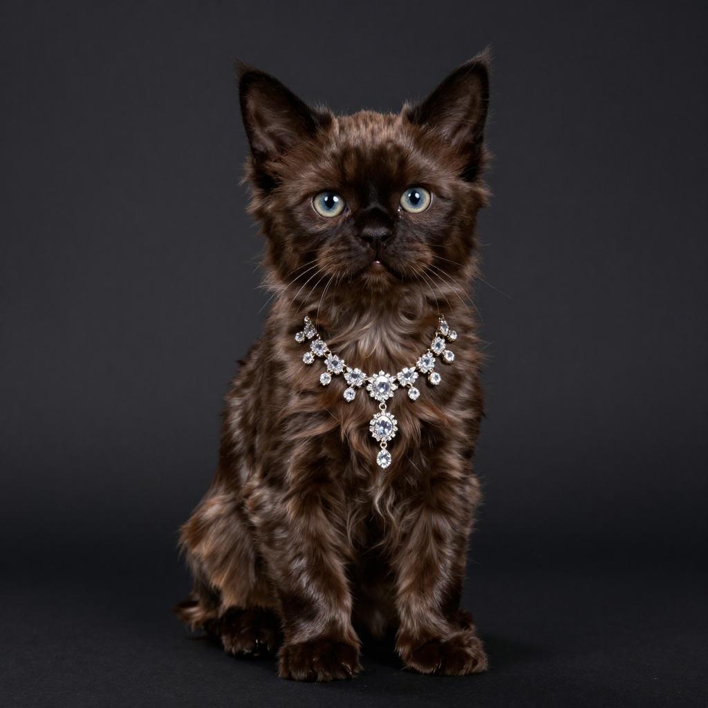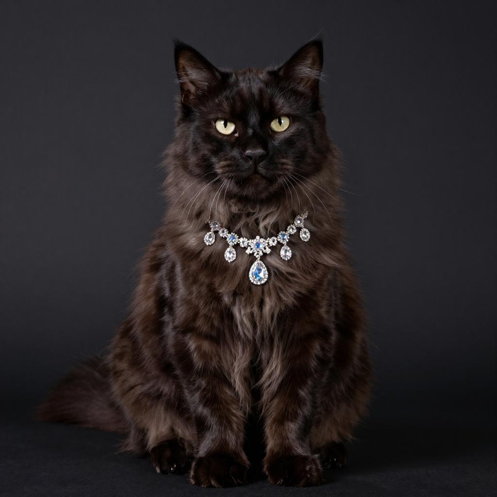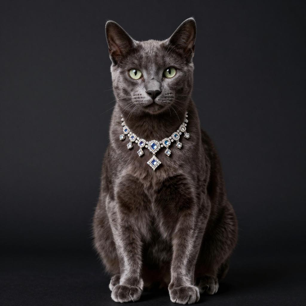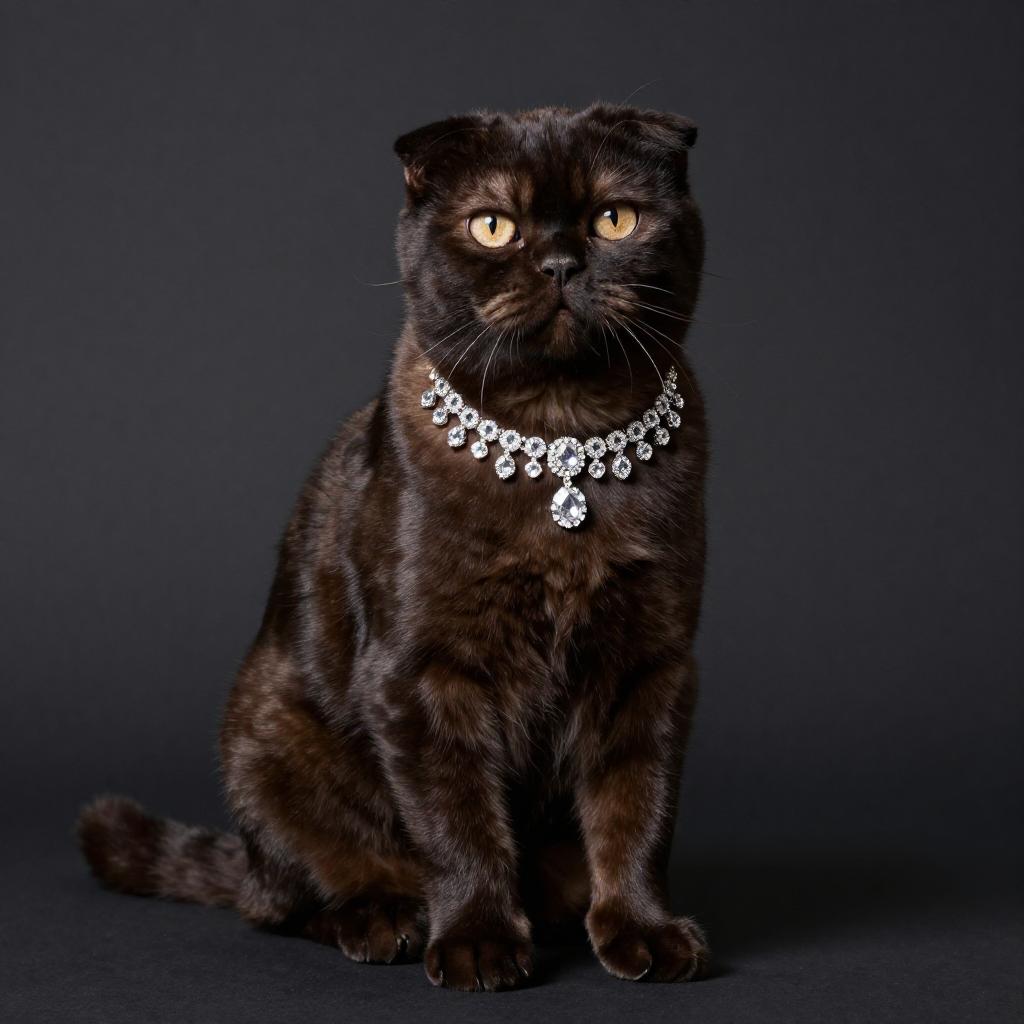 Luxurious studio portrait of a Oriental Shorthair cat sitting upright, glossy dark fur, wearing an ornate sparkling diamond necklace, clean dark background with spotlight, high-end fashion pet photography, high resolution, ultra-detailed