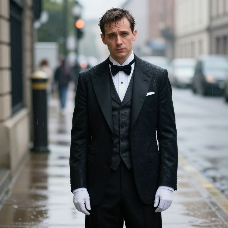 Wet-On-Wet a well dressed magician on the sidewalk in the rain. looking at camera with sadness in his eyes. medium shot, hyper real photography style, background in soft focus,