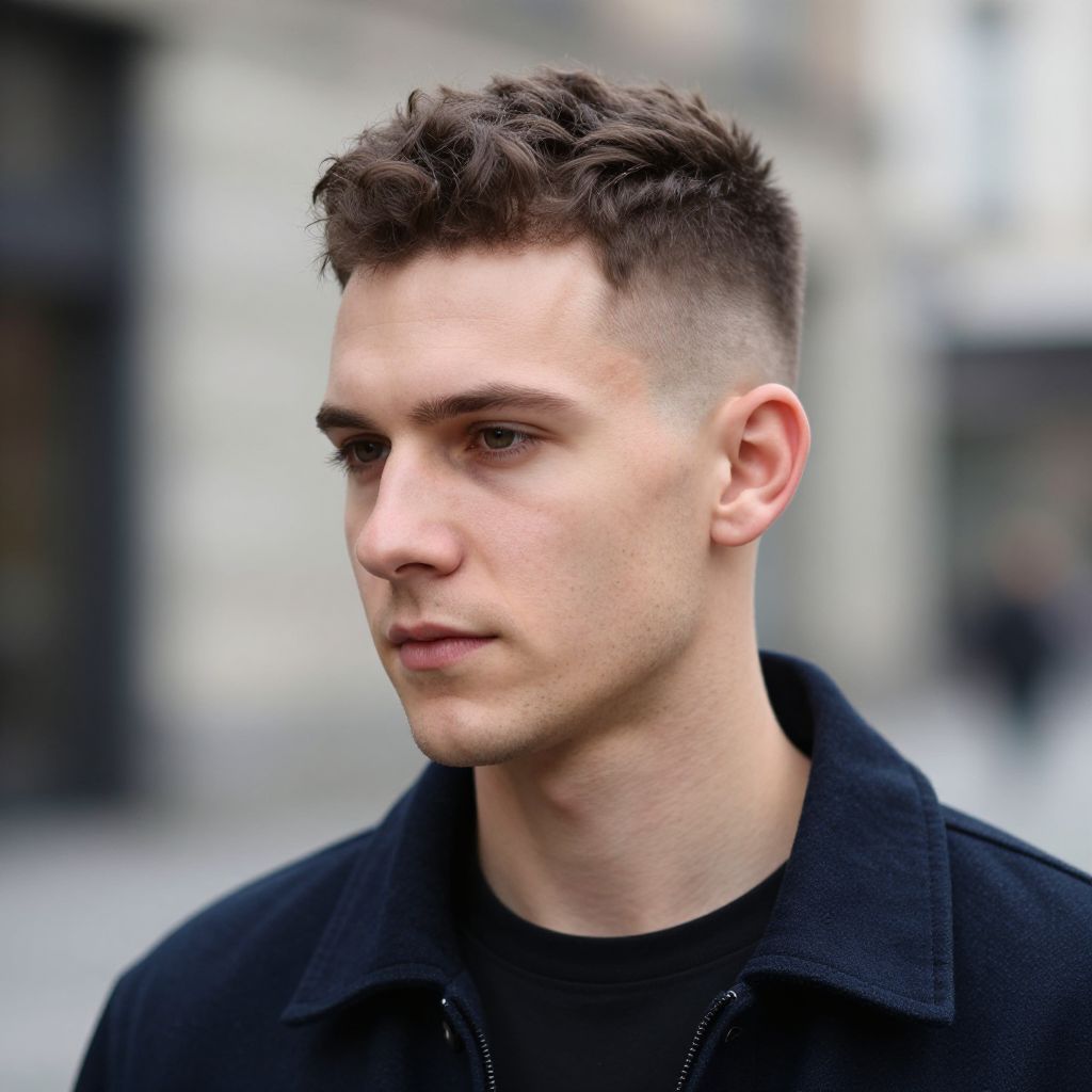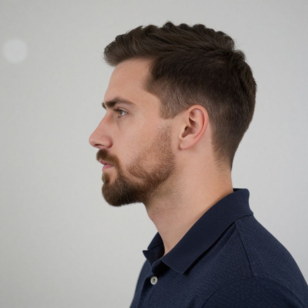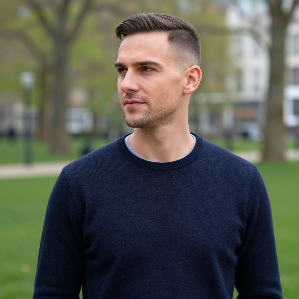 Fair isle sweater costume, 1boy, male focus, solo, realistic, outdoors, facial hair, looking at viewer, blurry background, blurry, photo background, short hair, upper body, tree, sweater, day