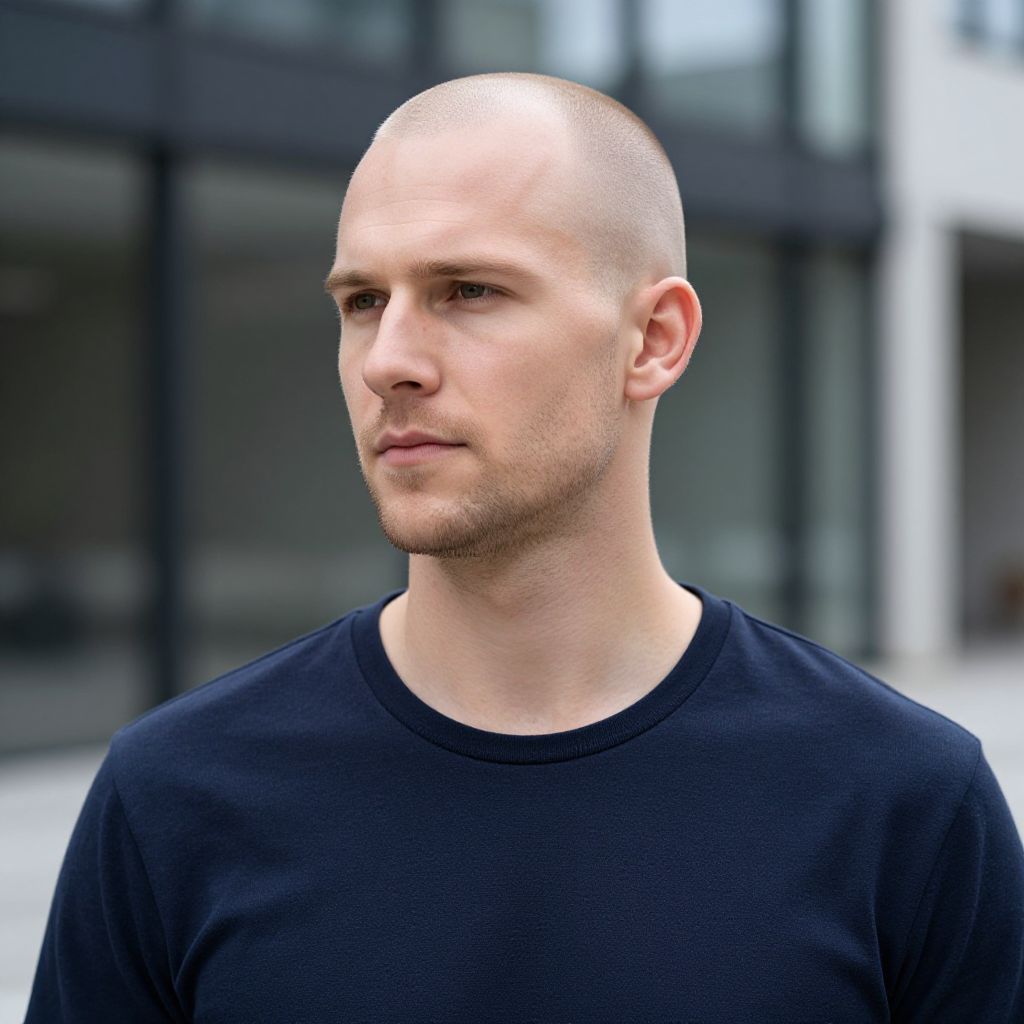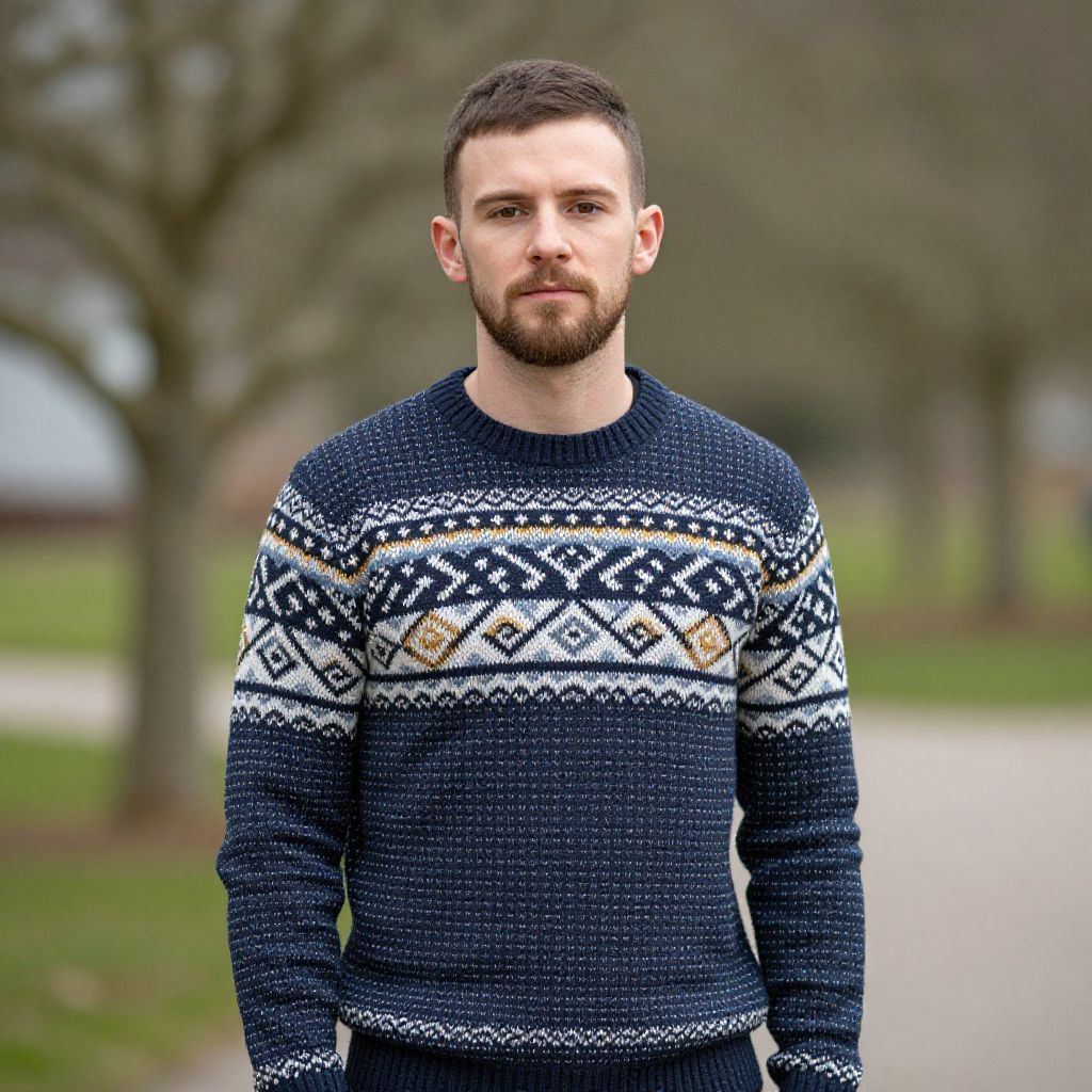 Photograph of a young Caucasian man with short dark brown hair and a full beard standing outdoors in a park. He has a fair skin tone and is wearing a dark blue, knitted sweater with white and gold geometric patterns across the chest and sleeves. The background is blurred, showing leafless trees and a grassy area. The man's expression is neutral, and he stands with his hands at his sides. The overcast lighting creates a soft, muted atmosphere. The park path is visible to his right.