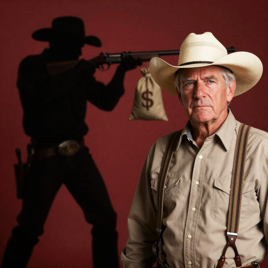 Photograph of an elderly man and a red-haired woman standing close together outdoors. Man in brown jacket, white cowboy hat, smiling. Woman in green scarf, smiling, leaning on man's shoulder. Background: large tree trunks, sunlight filtering through leaves. Both have warm, friendly expressions.