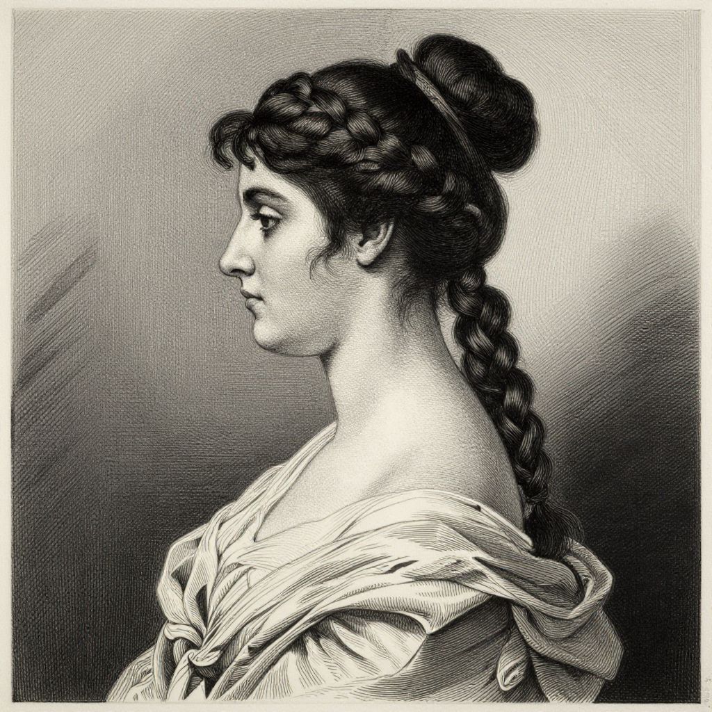 A detailed etching and drypoint illustration in the style of James Tissot, showcasing a profile of an elegant woman with intricately braided hair and a flowing garment, rendered with high-definition precision and dramatic lighting effects.