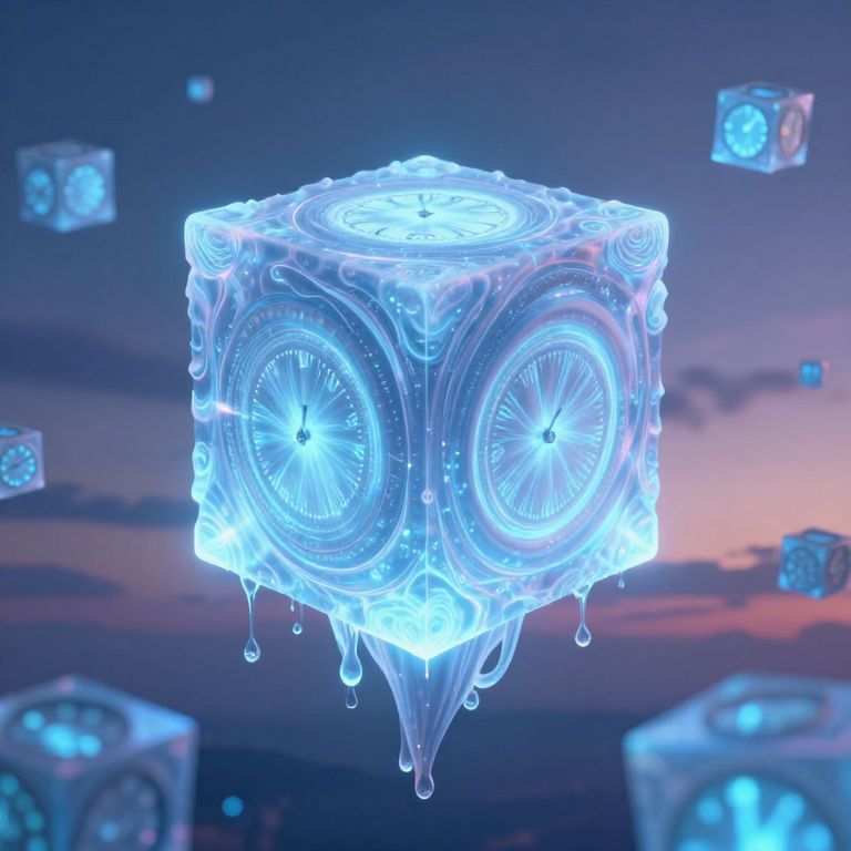A colossal, bioluminescent cube with swirling patterns and dripping tendrils floats serenely in a twilight sky, surrounded by an ethereal swarm of floating cubes adorned with glowing, frozen clocks.