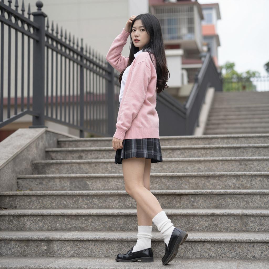 Asian woman with long black hair, wearing pink cardigan, white blouse, black plaid skirt, white leg warmers, black loafers, standing on stone stairs, hand in hair, looking over shoulder, iron fence on left, blurred buildings in background, daytime, photo.