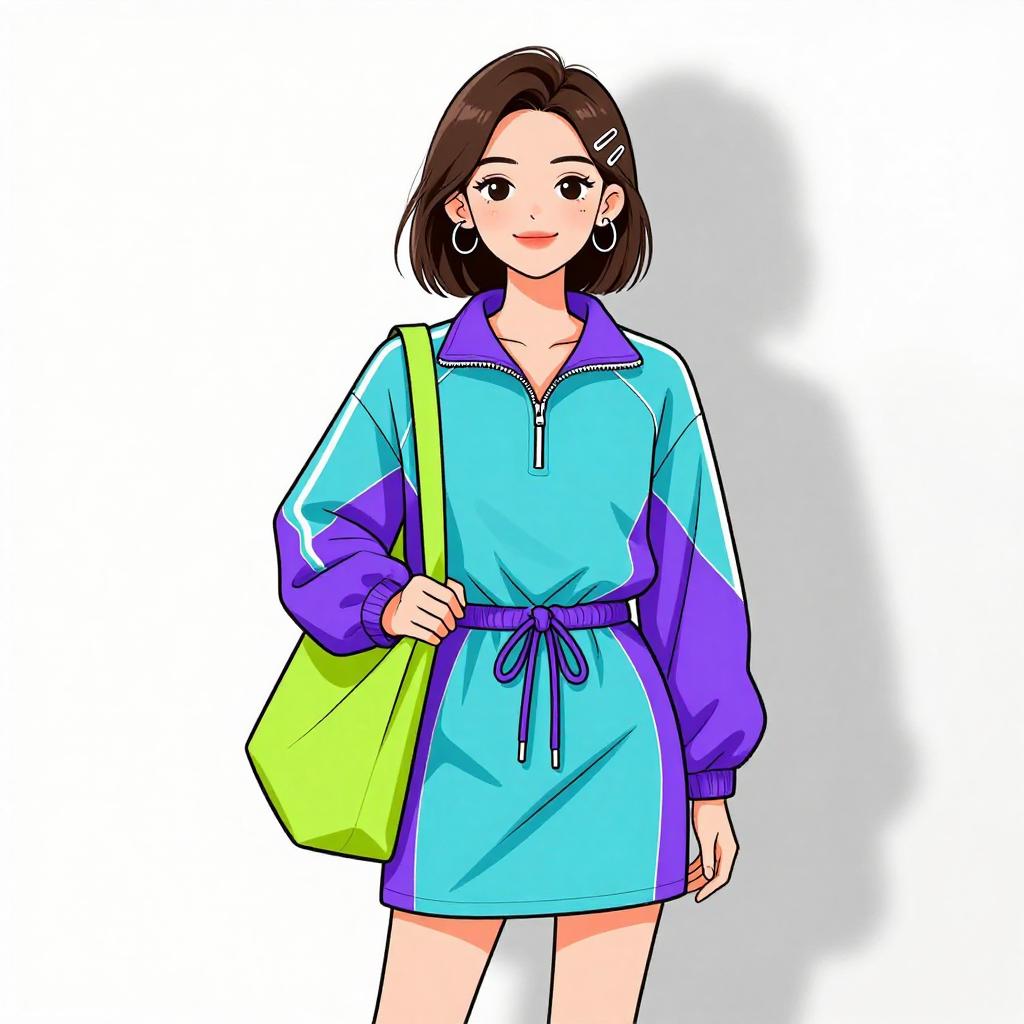 Woman with pretty face and pretty hair. smiling Woman, retro sporty, color-blocked windbreaker mini dress in turquoise and purple, quarter zip-up front, white piping detail, drawstring waist, cuffed long sleeves, matching purple collar, carrying a lime green tote bag, silver hair clips, studio background with a gradient from white to gray. --sref 1467