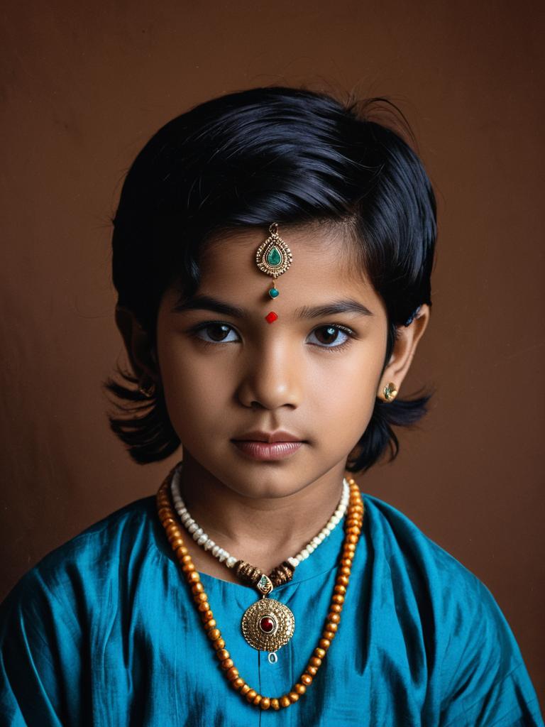 Child krishna kurta man, solo, male focus, 1boy, realistic, jewelry, necklace, looking at viewer, black hair, facial mark, forehead mark, upper body, beads, closed mouth, brown background, blue eyes