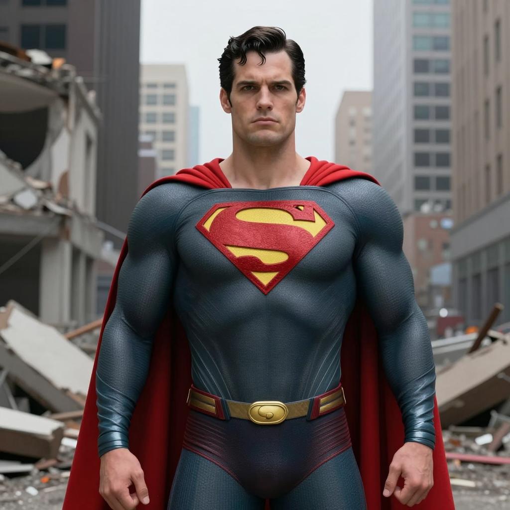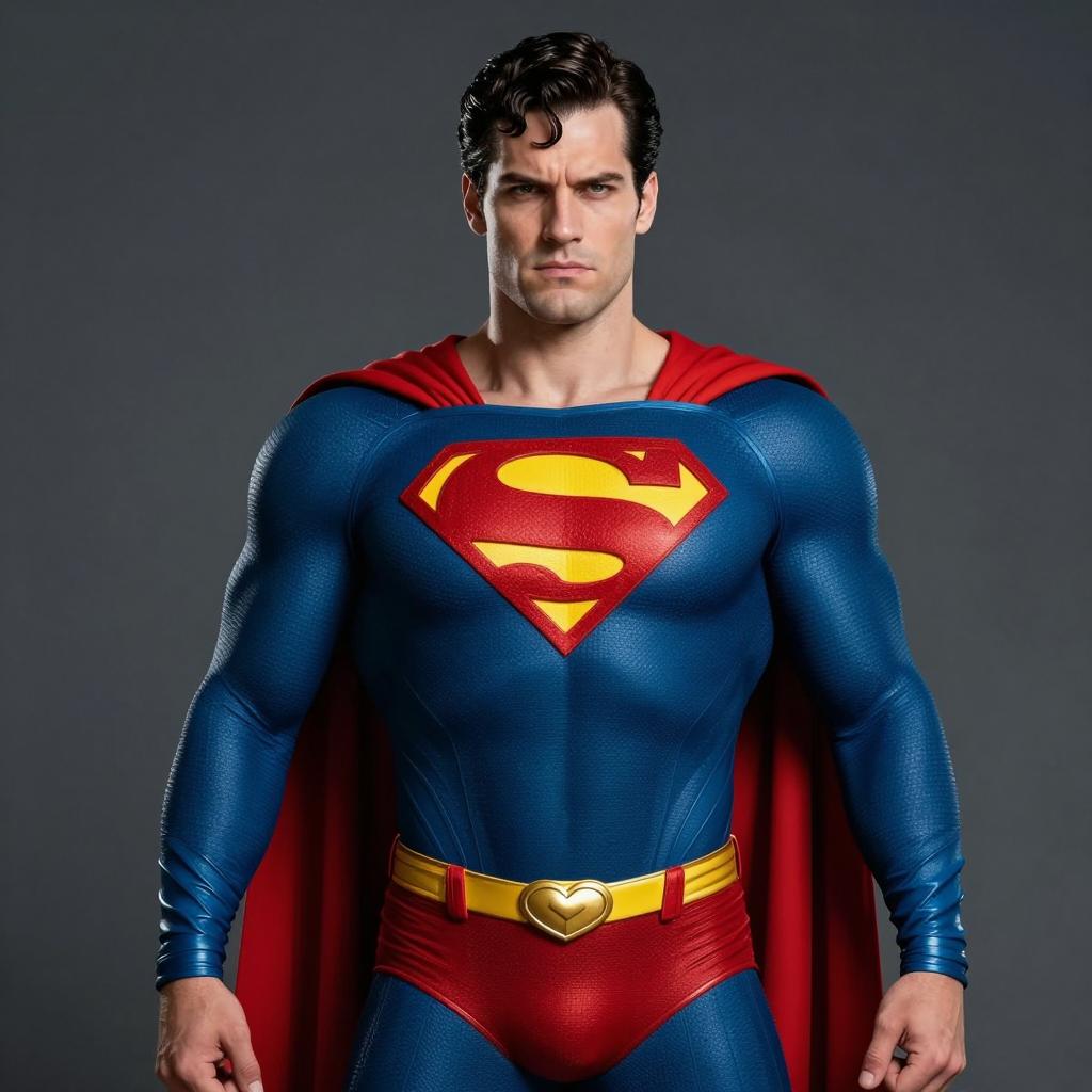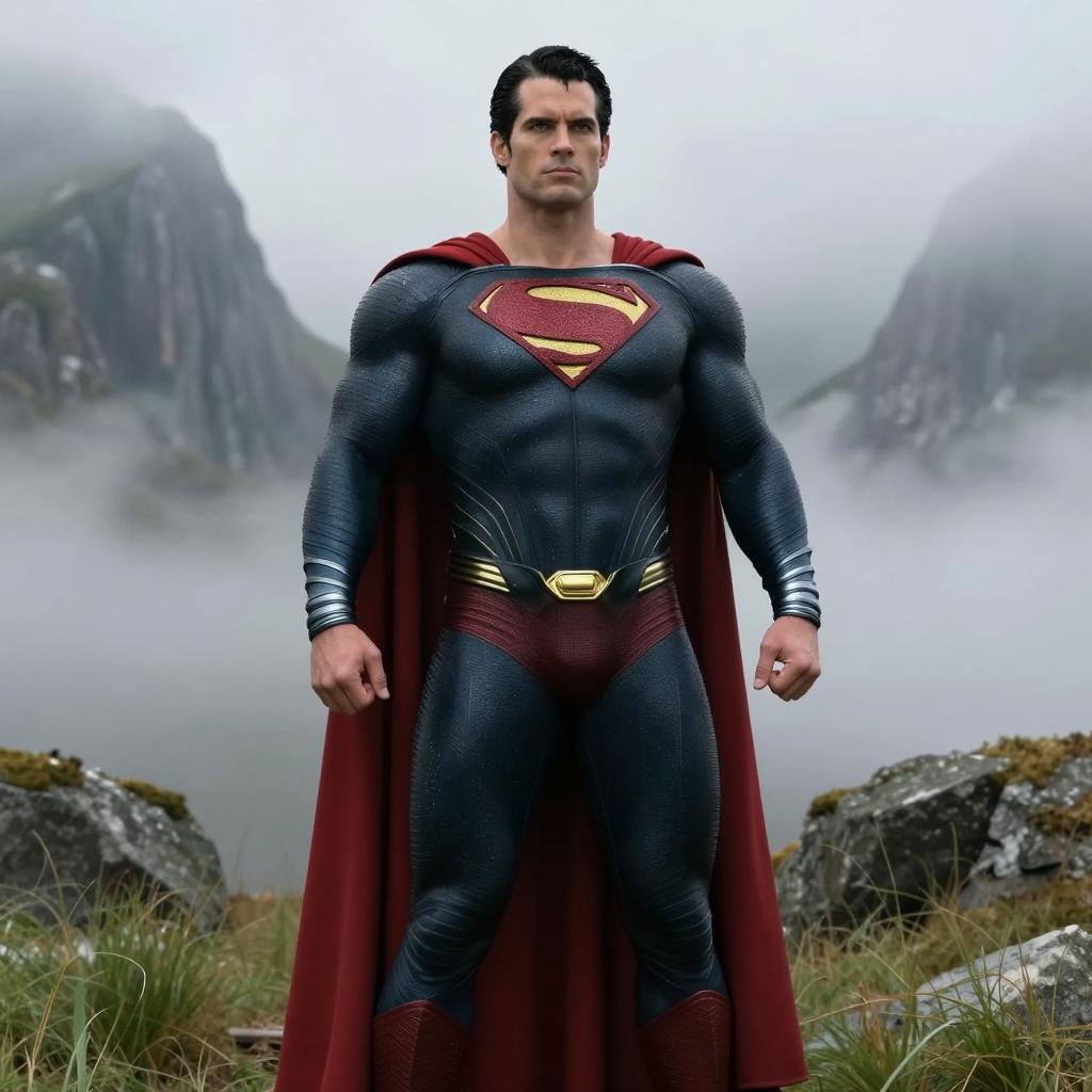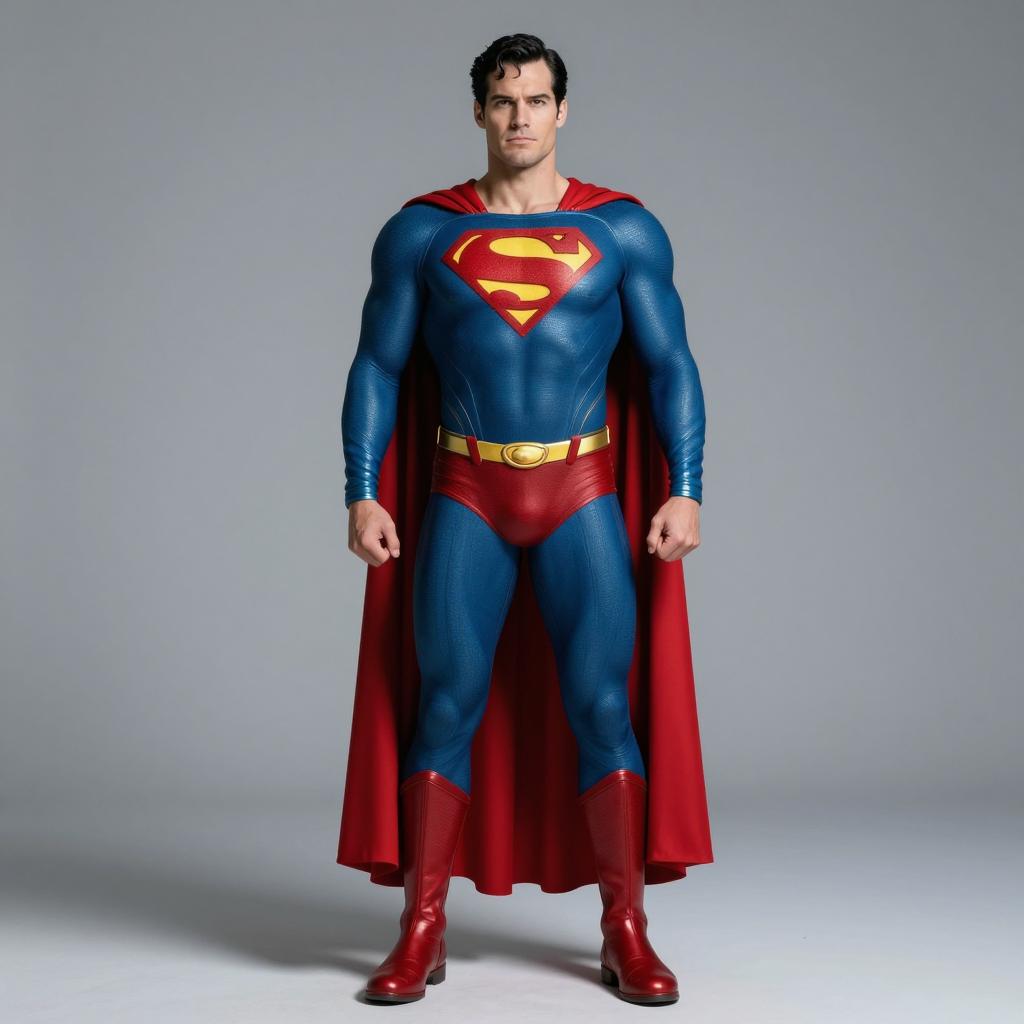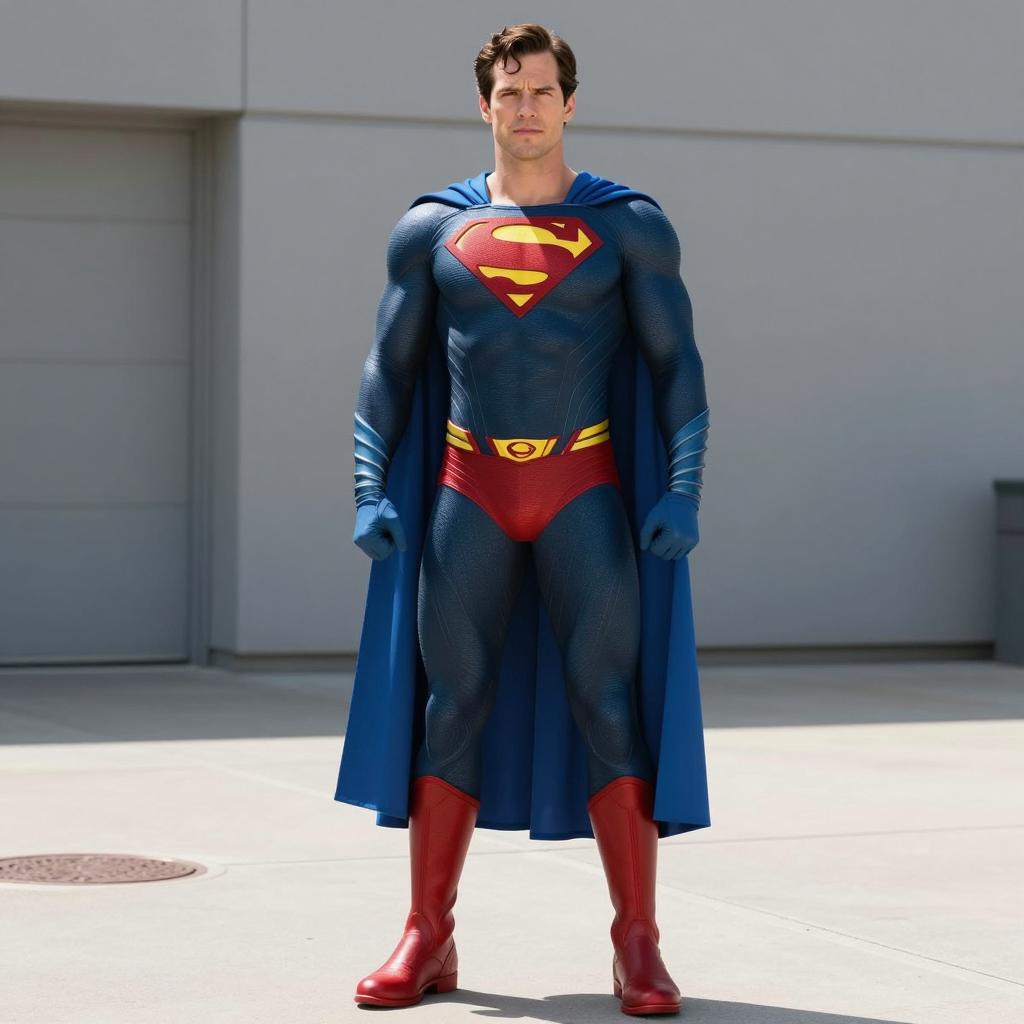 Action superman costume, photorealistic Superman standing, muscular physique, blue and red costume, prominent red "S" shield on chest, red cape flowing, strong stance, clear blue sky background, mountains in distance, sunlight from side, realistic ures, digital art, heroic pose, full body shot, highly detailed, strong jawline, short brown hair, confident expression, CGI style, comic book character, DC Comics, full frontal view