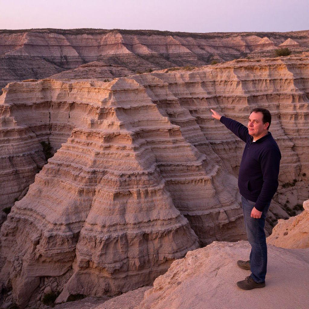 A detailed photo of layered rock formations on a cliffside in a remote mountain range, with the layers forming a stair-step pattern that appears to have been shaped by wind and water over millennia; the scene is captured at golden hour with warm hues of amber and rose lighting the rocks; a middle-aged man with a calm expression and deep-set eyes stands on a rocky outcrop, pointing toward the layers with a sense of awe.