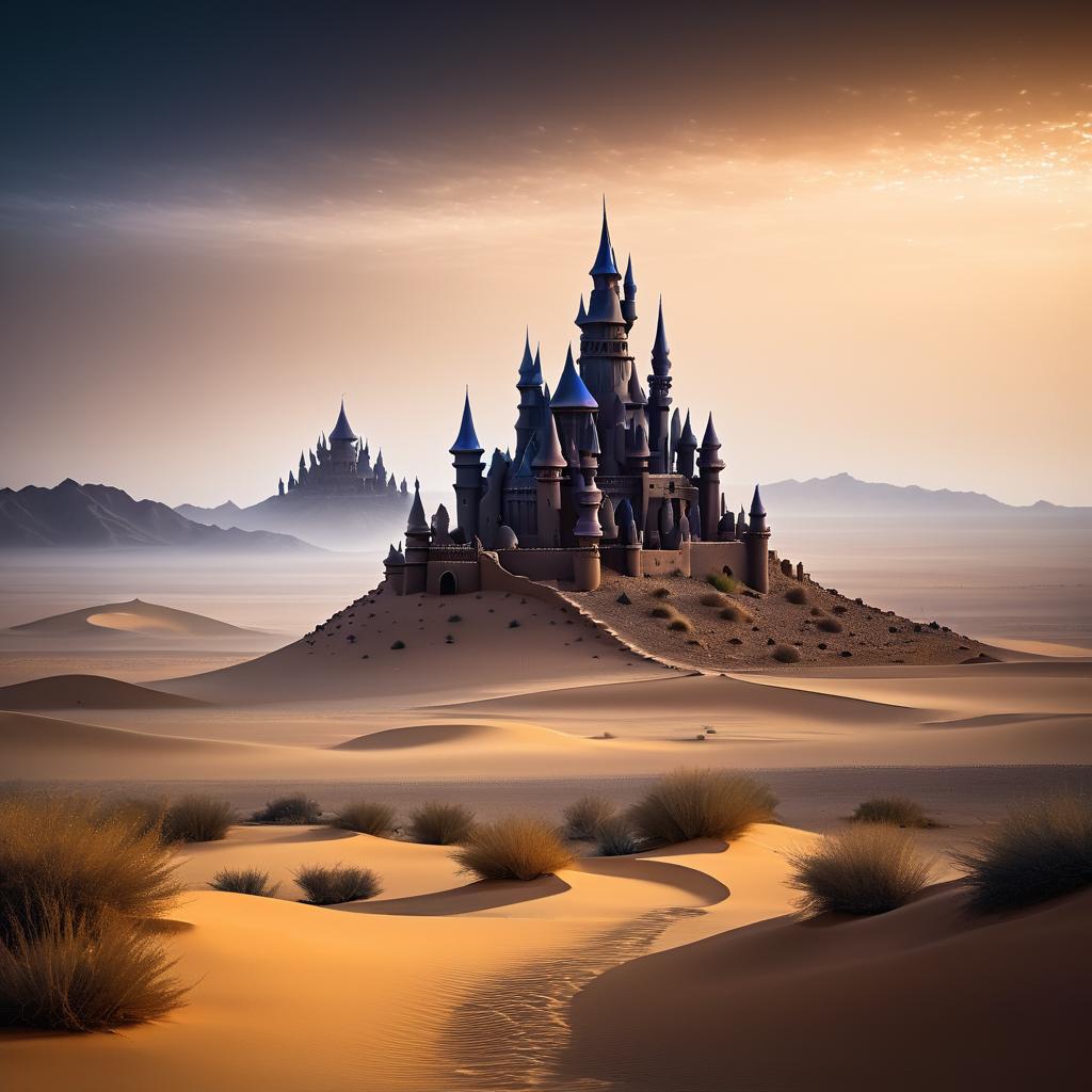 A dark fairy-tale castle perched on a hill in a mystical desert landscape at sunset. The castle features numerous spires and towers with pointed roofs, surrounded by sand dunes and sparse desert vegetation. The sky is dramatic with soft clouds, creating a dreamlike and mythical atmosphere.