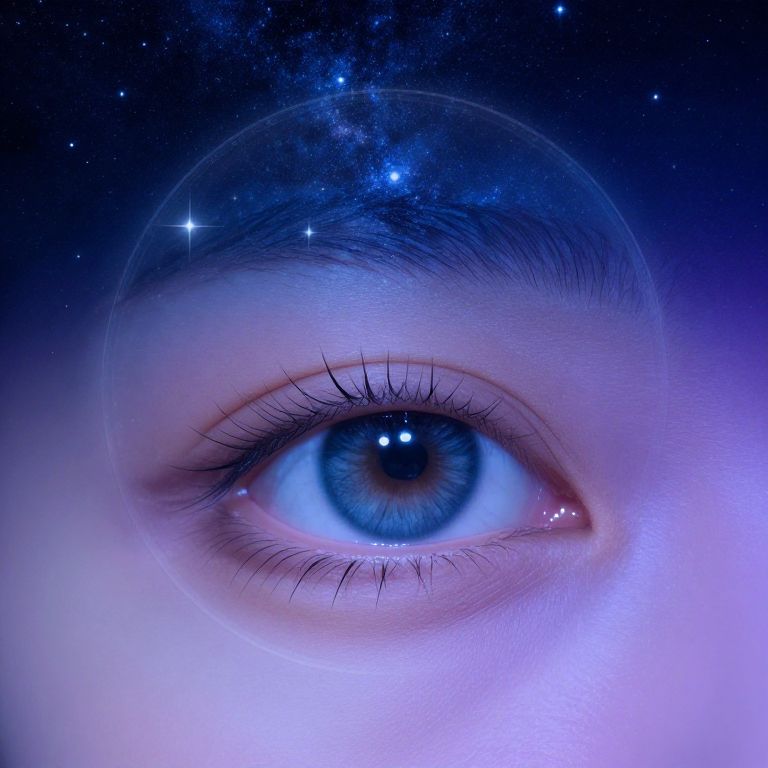 This is a digitally created image featuring a close-up of a human eye with a vivid blue iris and detailed black pupils. The eye is surrounded by a translucent, glowing sphere, reminiscent of a cosmic bubble, filled with sparkling stars and a Milky Way-like galaxy. The background transitions from deep blue at the top to lighter blue and white at the bottom, creating a surreal, ethereal effect. The eyelashes are long and black, and the skin around the eye is smooth and pale. The overall style is a blend of realism and fantasy, with a celestial theme.