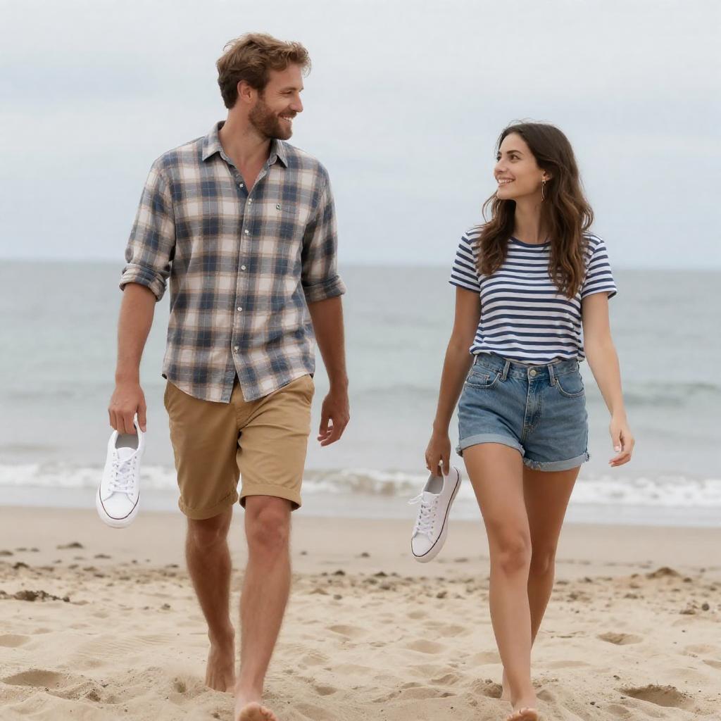 Photograph of a couple walking on a sandy beach. Man with short brown hair, beard, plaid shirt, and tan shorts holds a white sneaker in his right hand. Woman with long brown hair, striped shirt, and blue denim shorts holds a white sneaker in her left hand. Both smiling, looking at each other. Calm sea and cloudy sky in the background. Man on the left, woman on the right. Beach sand underfoot.