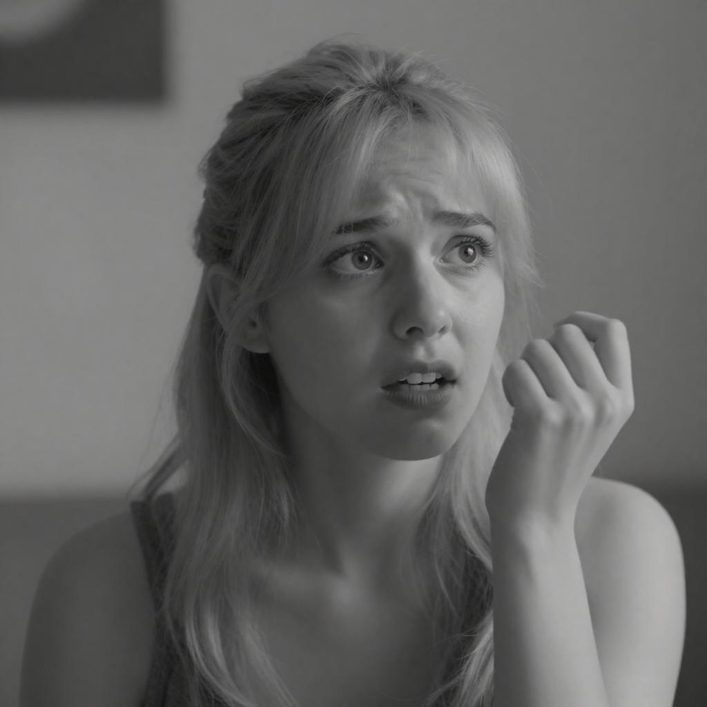 Black and white photograph of a young woman with light-colored hair and bangs, looking slightly to the right with a concerned expression. She has her right hand raised near her face, fingers slightly curled. She is wearing a sleeveless top. Background is blurred. Her teeth are visible, and her eyes are wide. The lighting highlights her facial features.