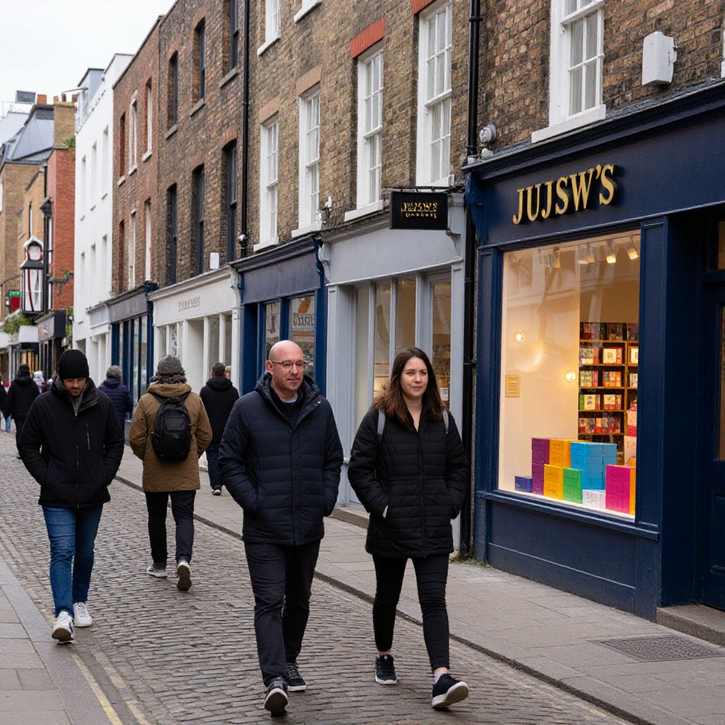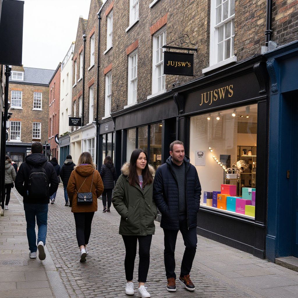 Pedestrians stroll along a narrow cobblestone street lined with historic brick buildings featuring diverse storefronts, including a visible \"JUJSW'S\" sign above a shop displaying colorful boxes and illuminated interiors, while a man and woman stand prominently in the foreground.