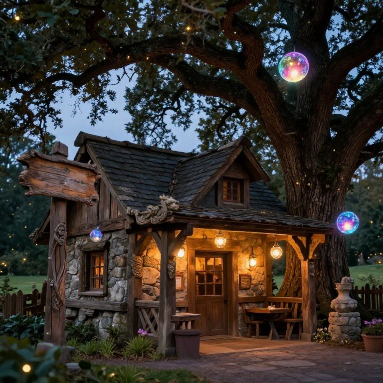 Photograph of a whimsical, fairy-tale style wooden and stone playhouse under a large tree, illuminated by glowing lights and colorful orbs at dusk