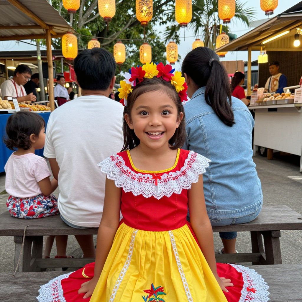 A festive outdoor scene of a family gathered at a festival in Cebu, where a young girl in a full Philippine Independence Day costume is posing with big, joyful eyes and a bright smile, wearing a red and yellow traditional dress with a lace collar and floral accessories, sitting on a wooden bench surrounded by lanterns and local food vendors.