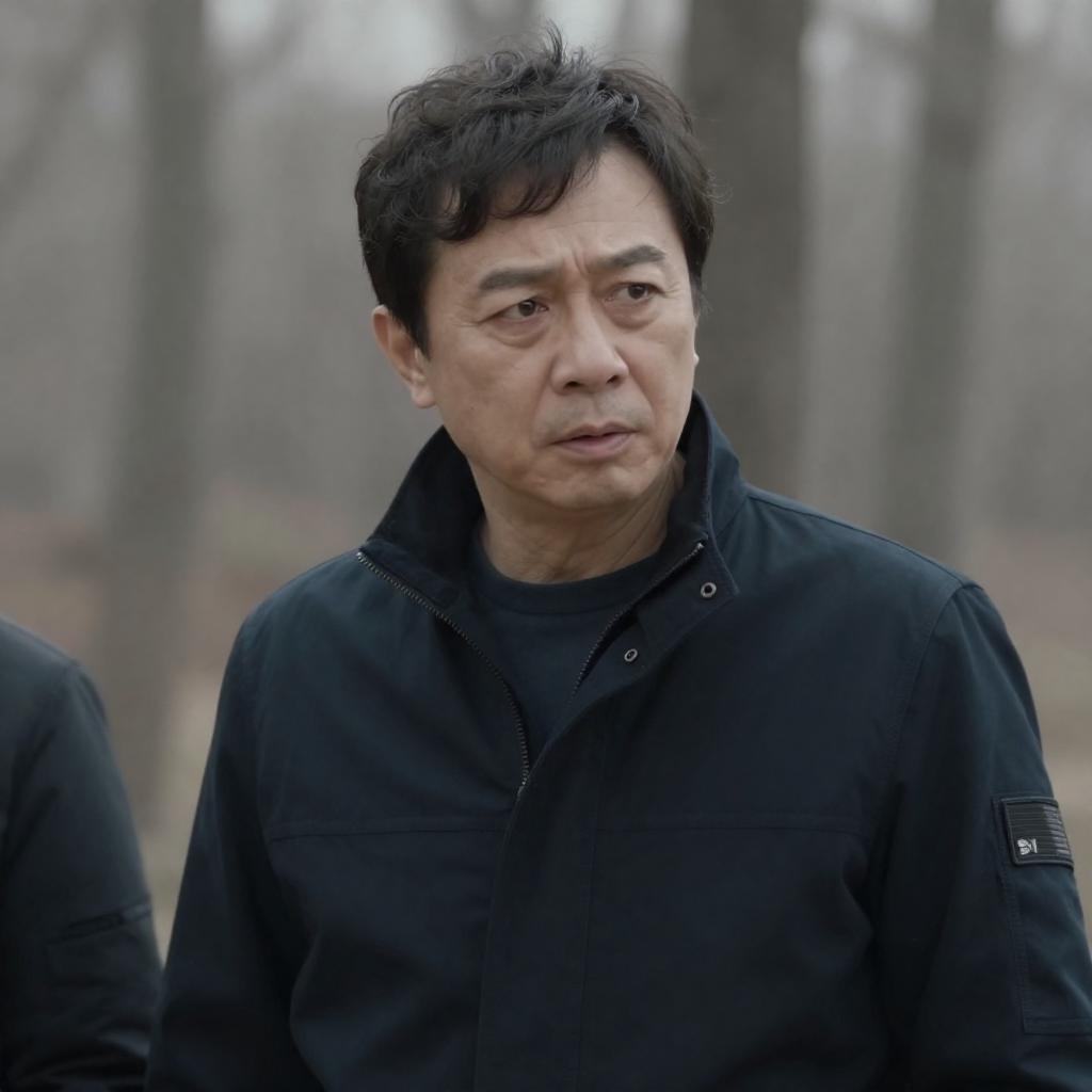 Two men standing closely in a dimly lit room with wooden panel walls. The man on the left has a shaved head, light skin, and wears a black shirt with a gray jacket. The man on the right has dark hair, medium skin, and is dressed in a green shirt and black jacket, resting his right hand on the other man's shoulder. Both exhibit intense facial expressions.