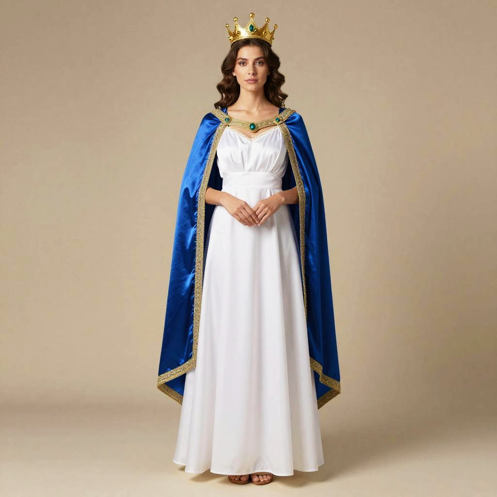 Grecian fancy dress costume, woman in a white dress and gold crown and blue cape