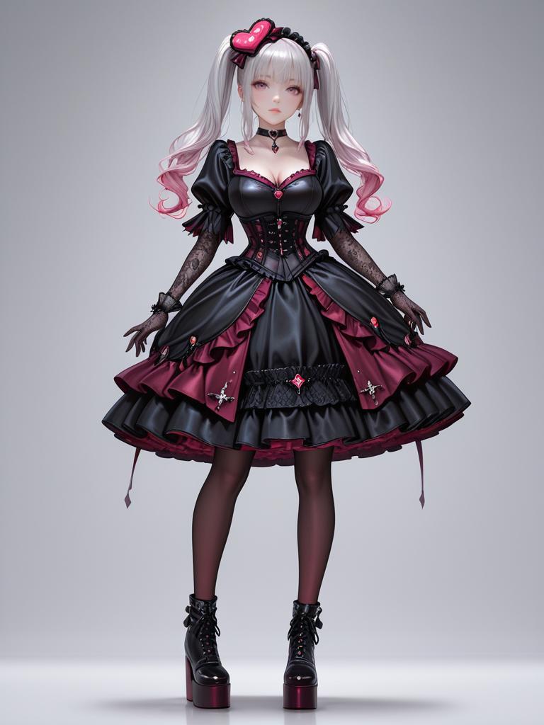 1girl, realistic face, Gothic corset gown, burgundy silk corset, sweetheart neckline, sheer black organza overlay, asymmetrical hemline, layered tulle petticoat, silver filigree details, matching choker, dramatic black lace gloves, platform ankle boots.