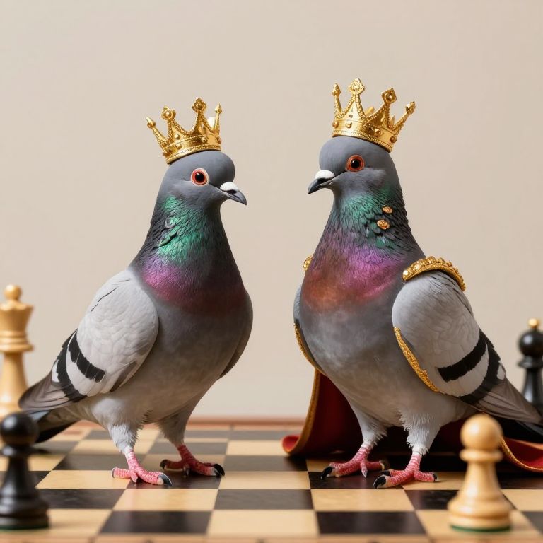 Photograph of two pigeons wearing golden crowns and regal gold-trimmed robes, standing on a chessboard with black and white chess pieces
