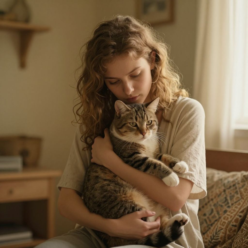 In a quiet chamber bathed in soft, golden light, a woman cradles a cat, her gaze tender yet introspective, symbolizing the delicate balance between human vulnerability and the serene companionship of the natural world.