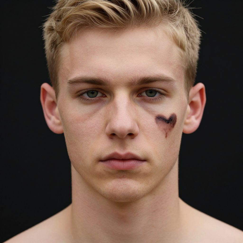 Close-up portrait of a young blonde man with short hair and fair skin. He has a dark heart-shaped paint or mark on his right cheek and a serious expression. The background is black, and the man is shirtless, highlighting the upper body. The lighting emphasizes the realistic texture of his skin and facial features.