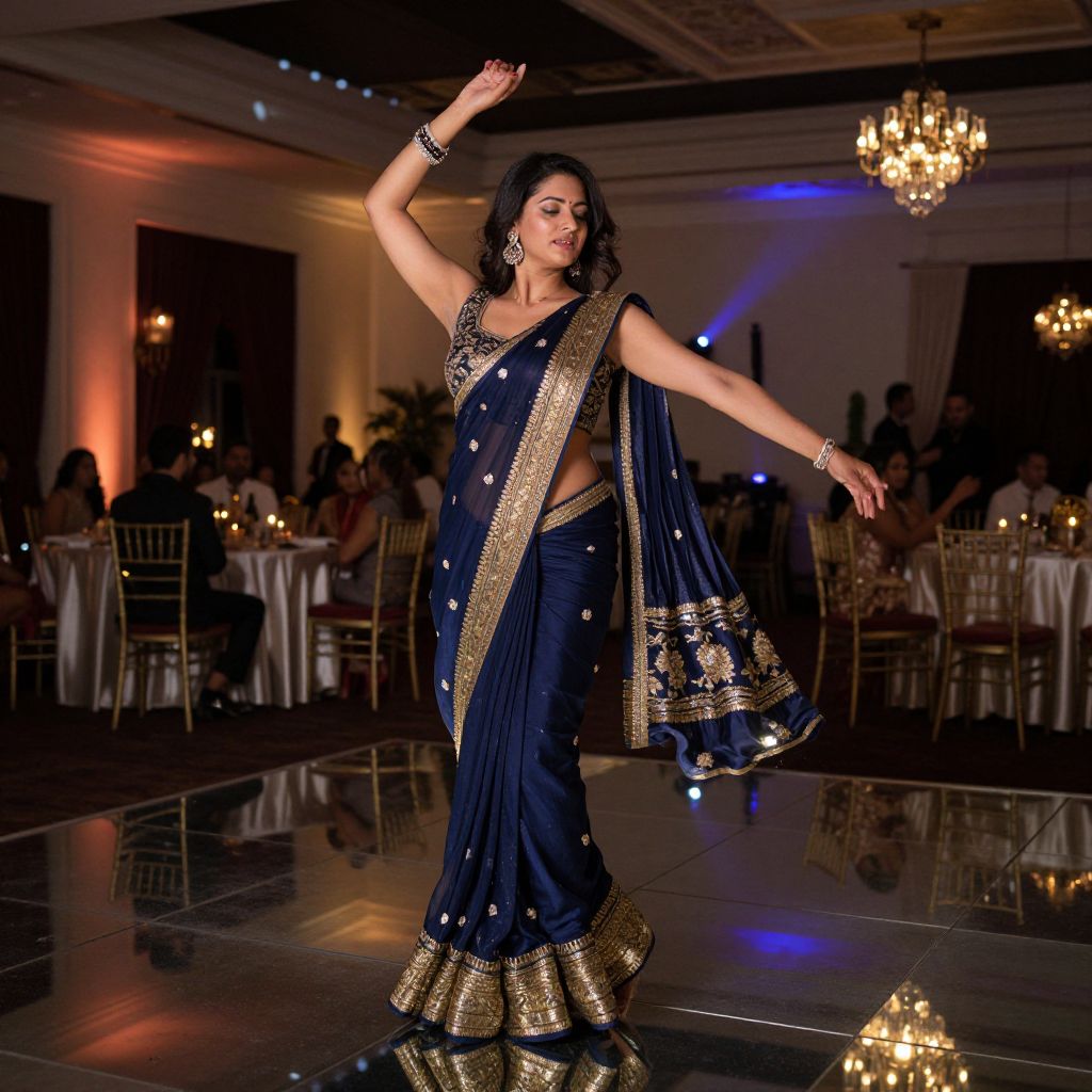 A beautifully curated nighttime event at a high-end Indian banquet hall where a woman dressed in a luxurious midnight blue night party saree with gold zari detailing dances gracefully on a mirrored dance floor, under disco lights and soft ambient music, her face glowing in the dim, elegant glow.. The woman has big tits and cute face