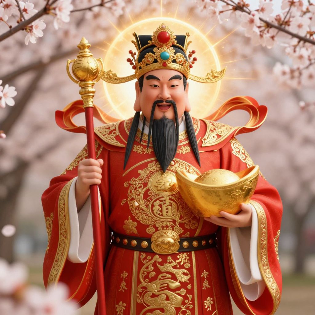 Elegant God of Wealth Chinese amidst blooming cherry blossoms, holding a scepter and gold ingot, radiant golden aura shining, traditional red and gold color scheme, intricate calligraphy in the background, symbolizing luck, prosperity, and happiness in ancient Chinese culture.