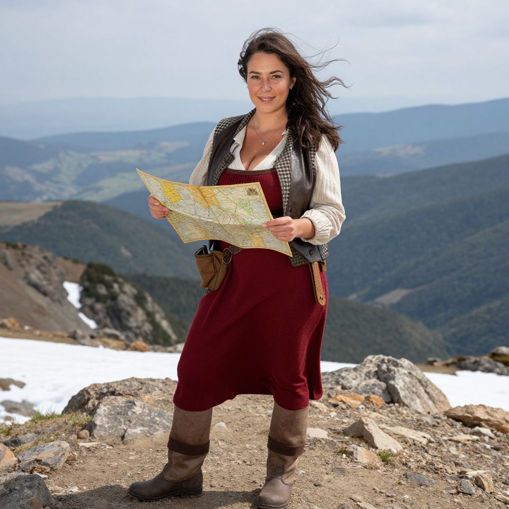 A realistic woman in her early 30s with soft brown eyes, sun-kissed skin, and a friendly smile, wearing a period-accurate explorer costume including explorer boots, a checkered vest, and a leather vest over a red wool dress, standing on a mountain plateau in a remote alpine region, with a vintage brass map in her hands, wind blowing through her hair and snow dusting the rocky terrain below. The woman has big tits and cute face