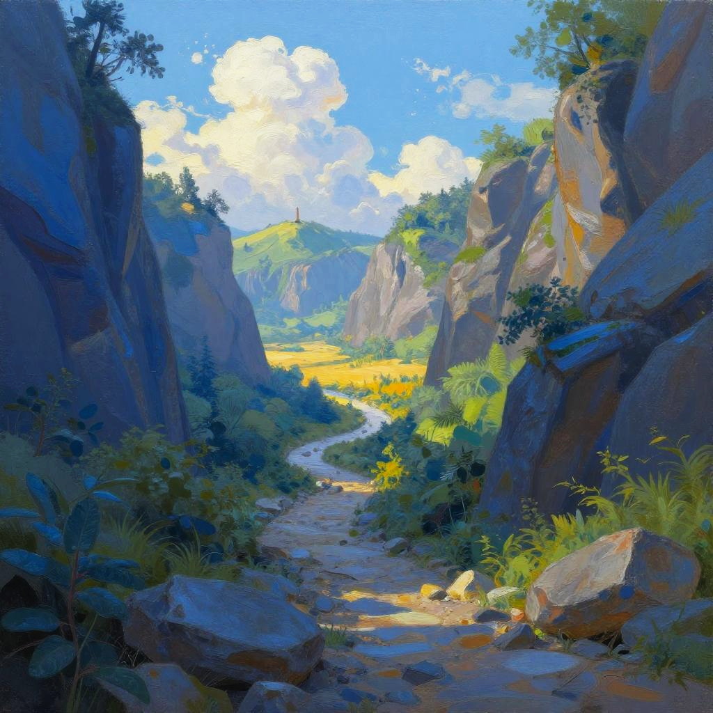 Oil painting realism landscape set in winding river canyon at sunrise, bright blue sky with fluffy clouds. Oversized blue-tinted shapes frame a rocky path winding into a glowing golden field; a small landmark rests on a distant hill amid lush greenery. Saturated palette, crisp outlines, dithered textures, soft bloom, subtle fog, playful particles, storybook charm, majestic and peaceful.