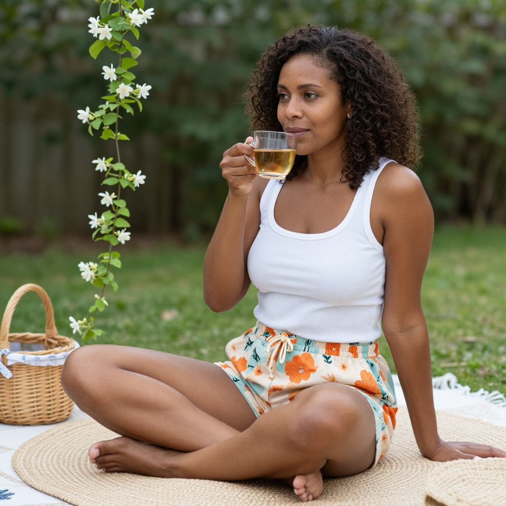 A woman in her early 40s with dark brown skin and a natural curly hairstyle sits cross-legged on a woven outdoor rug during a spring picnic, wearing soft floral print shorts with orange, cream, and mint-colored blooms, enjoying a cup of tea while a blooming jasmine vine hangs nearby.