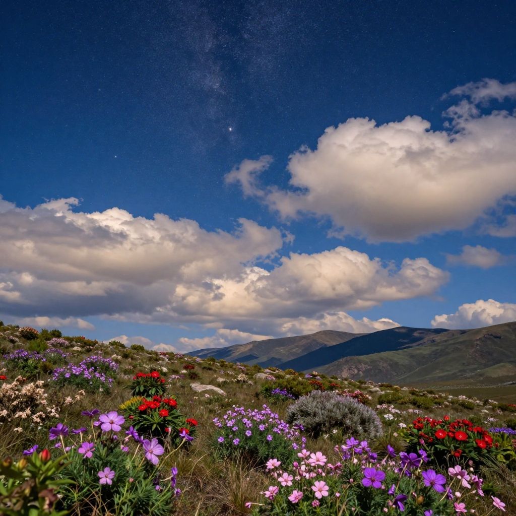 <8k, high detail, uhd, sharp focus, palette, photorealistic, absurdres, extreme detail, as much detail as possible>, a mesmerizing scenery of clouds and stars showing a natural landscape, celestial objects in a beautiful sky, flowers, mountains, shrubland, noon, the most beautiful image in the world, bright indigo, matte green, muted red, bright violet, shiny beige, muted pink