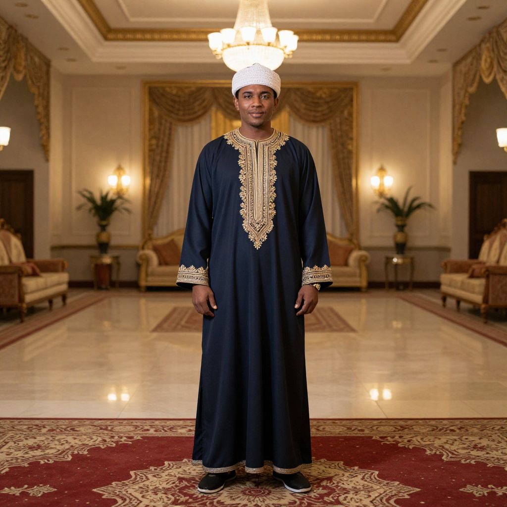 Photograph of a Black man standing in an opulent room. He is wearing a long, dark blue traditional garment with intricate gold embroidery on the neckline and sleeves, and a white skullcap. The room features a polished marble floor, ornate red and gold carpet, and elegant gold drapes. Two armchairs with brown cushions are positioned on either side, and two potted plants are visible in the background. A large, bright chandelier hangs from the ceiling, casting a warm glow over the room. The man stands centrally, looking directly at the camera with a neutral expression.