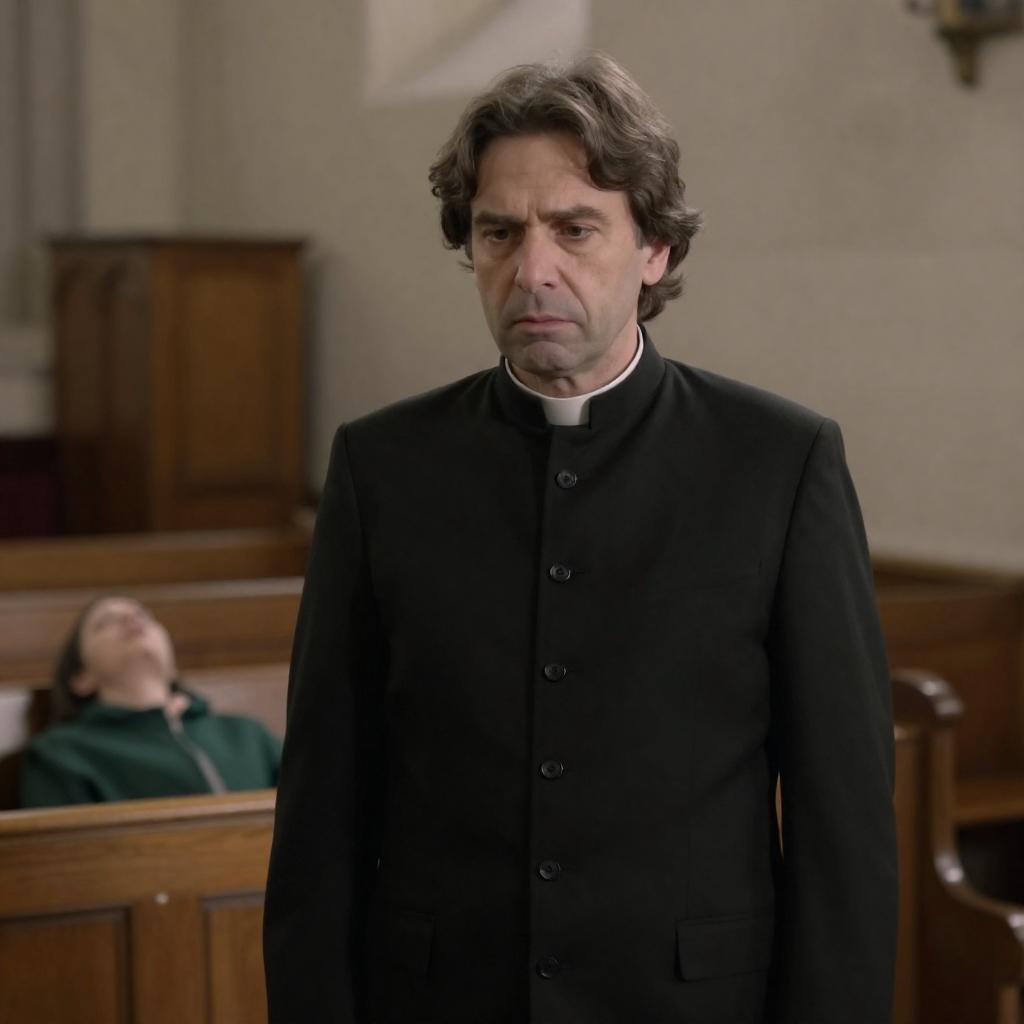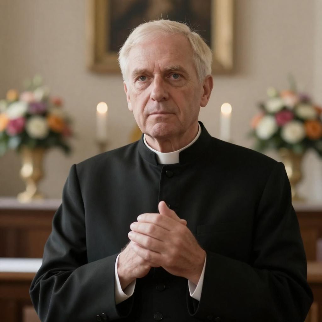Photograph of an elderly white man with short blonde hair, wearing a black clerical robe and white clerical collar, holding his hands together in front of his chest. Background has blurred floral arrangements and candlelit church decor. Sunlight filters through, illuminating the scene. The man has a neutral, slightly serious facial expression.