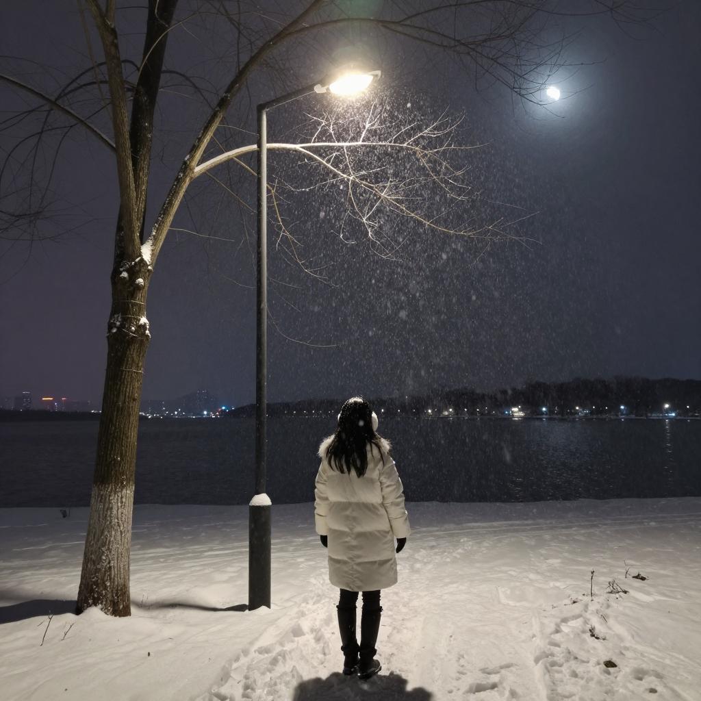 Photograph of a winter night scene. A woman in a white coat and black boots stands under a lit streetlamp, facing away. Snowflakes fall heavily. A leafless tree on the left, snow-covered ground, and a lake with city lights in the background. Full moon in the sky. One person, intense moonlight.
