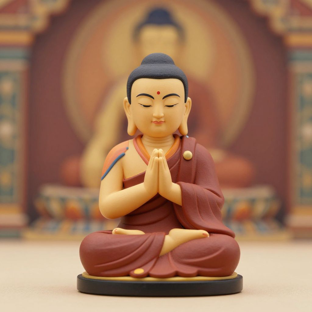 Realistic tibetan monk in pop art toys, digital art, big buddha background, vintage colour scheme, praying, peaceful, calm , elegant,