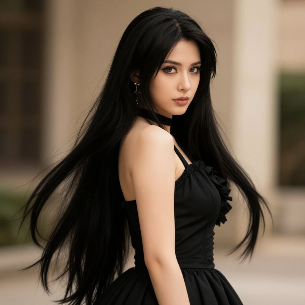 This is a highly realistic digital artwork of a young woman with long, straight, black hair flowing past her shoulders. She has pale skin and dark, intense eyes with subtle makeup. She is wearing a sleeveless, black, ruffled dress that accentuates her slender figure. She has a small cross earring in her left ear. The background is slightly blurred, featuring beige and brown tones, suggesting an urban setting. Her expression is serious and slightly aloof. The lighting highlights her hair and face, creating a soft glow on her skin. The overall style is hyper-realistic, focusing on detailed textures and lifelike proportions.