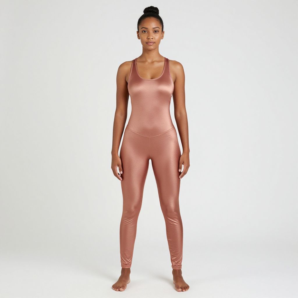 Photograph of a woman standing against a plain white background. She has a medium brown skin tone, dark hair in a bun, and a slim, athletic build. She's wearing a shiny, rose-gold, full-body workout suit with a scoop neckline and no shoes. Her expression is neutral, and she's standing with her arms relaxed at her sides. The lighting is even, highlighting the smooth texture of her outfit.