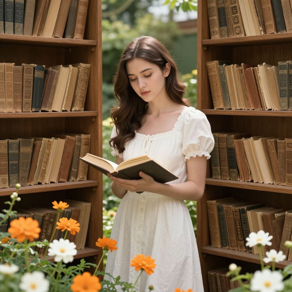 A young woman stands gracefully between wooden bookshelves filled with aged volumes, her hands gently cradling an open book while vibrant orange and white flowers bloom around her in a sunlit garden, creating a serene blend of literature and nature.