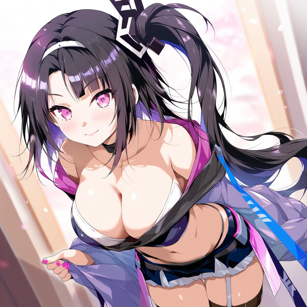 Architect (girls' frontline), girls' frontline, 1girl, pink eyes, purple eyes, black hair, very long hair, side ponytail, hair ornament, medium breasts, large breasts, cleavage, navel, collarbone, bare shoulders, pink nails, nail polish, one side up, by artist porurin, animagine