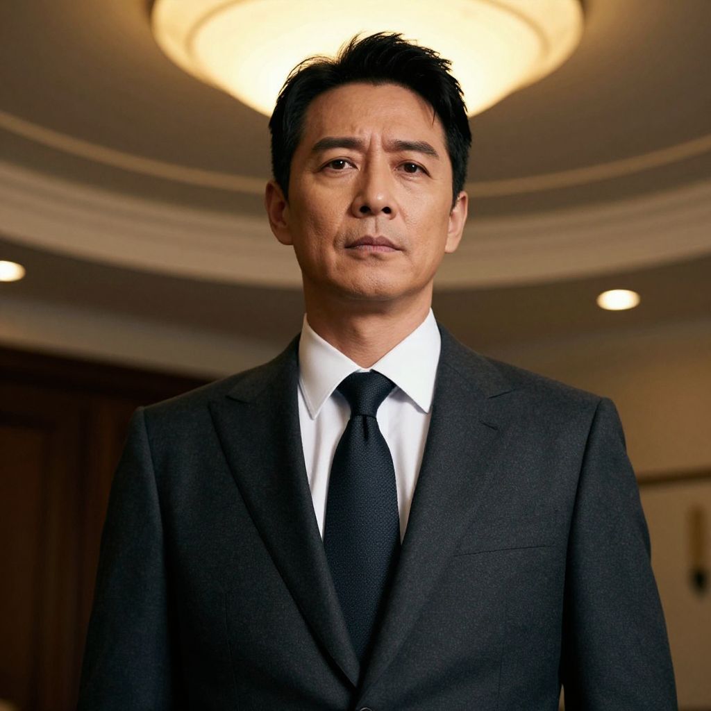 "Famous Actor, man in a suit and tie in a room with a ceiling"