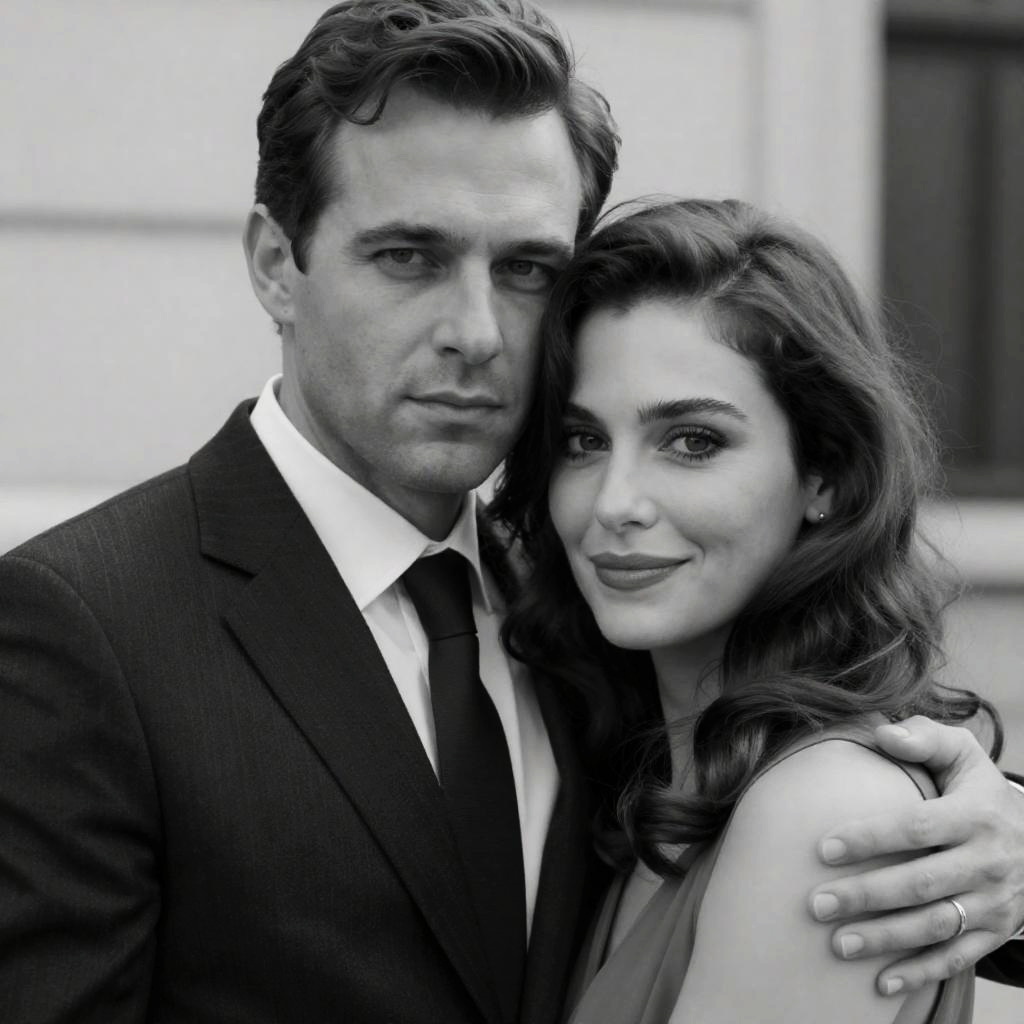 Black and white photo of a happy couple standing indoors. The woman has curly blonde hair and is wearing a strapless, ruched dress while holding a cloth in her left hand. The man is dressed in a suit and white dress shirt, smiling and standing close to the woman. The background features a wooden door and wall paneling.