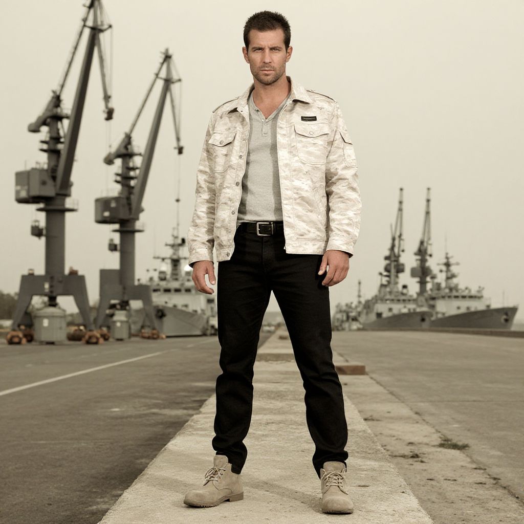 A man, lightweight camouflage field jacket, slim-fit black jeans, gray henley shirt, suede desert boots, black leather belt, concrete docks, towering cranes, military vessels lined up, vintage photo style, confident expression Man has masculine face and piercing eyes