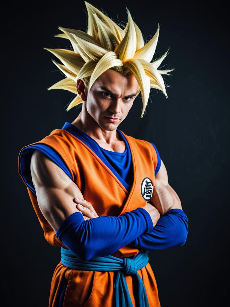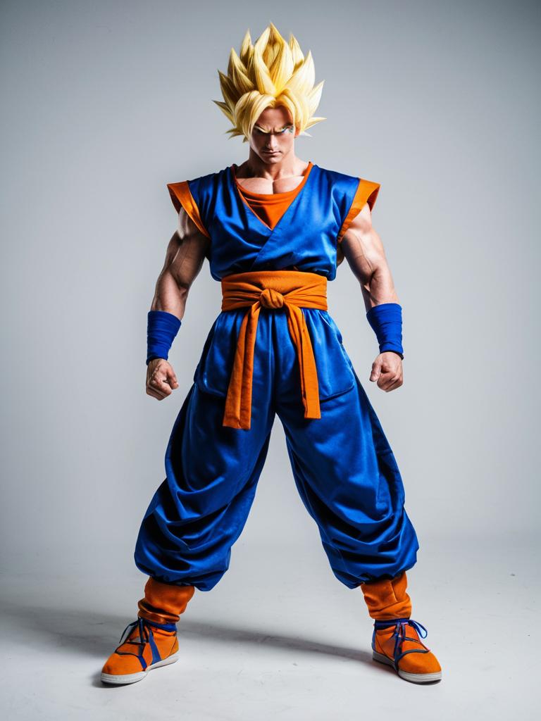 Man in Dragon Ball Super Saiyan costume, professional cosplay studio portrait