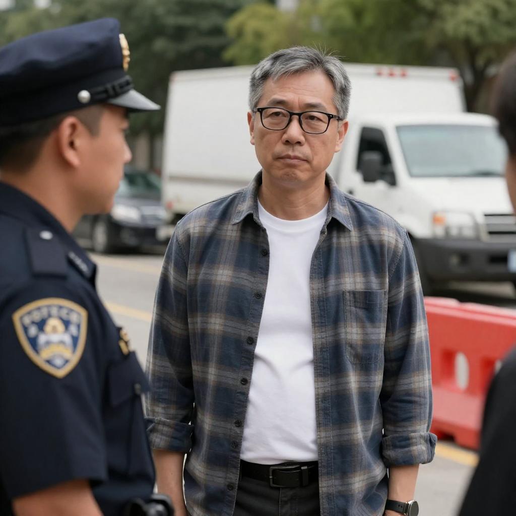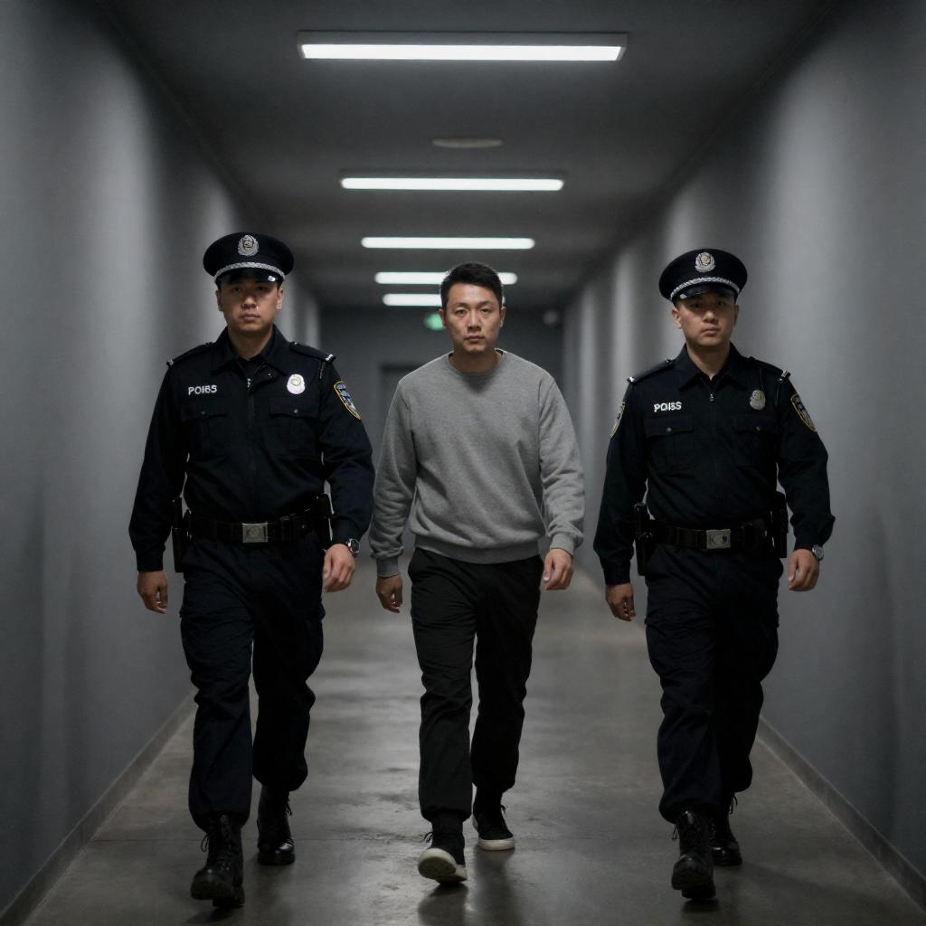 Three men in a dimly lit, gray, narrow hallway. Two uniformed police officers in dark jackets and hats, one in gray sweatshirt and pants, walk forward. Officers on left and right, central man in middle. Fluorescent light overhead.