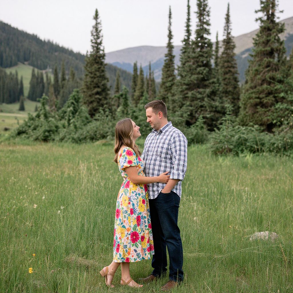 Photograph of a couple standing in a lush, green meadow with tall, dense pine trees and rolling hills in the background. The woman, with long brown hair, wears a colorful floral dress and stands barefoot on the grass, leaning slightly into the man. The man, with short brown hair, wears a white and black checkered shirt and black pants. They are looking into each other's eyes, with the man's arms gently around the woman's waist. The sky is overcast, casting a soft light over the scene. The couple's attire and the natural setting suggest a romantic, outdoor moment.