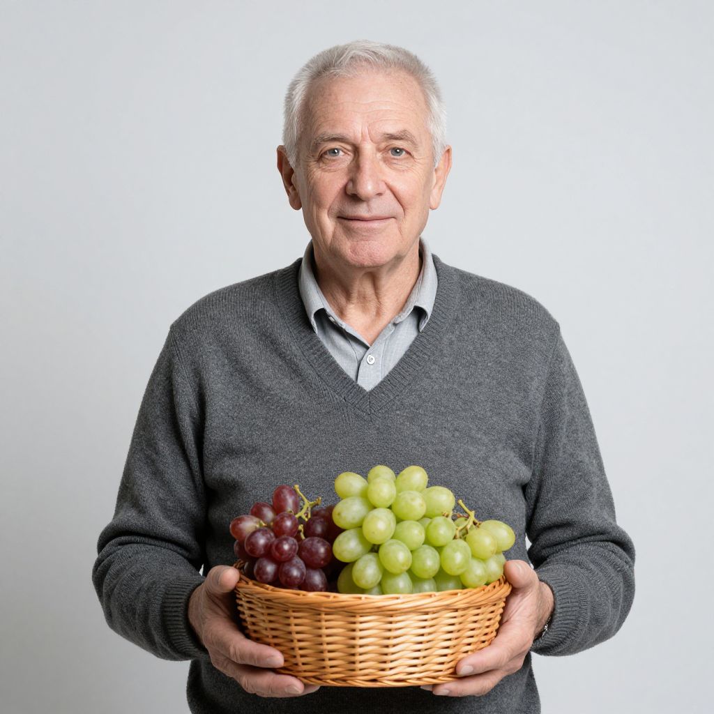 Photograph of an elderly man with white hair, wearing a gray sweater and light shirt, holding a wicker basket of green and red grapes, smiling
