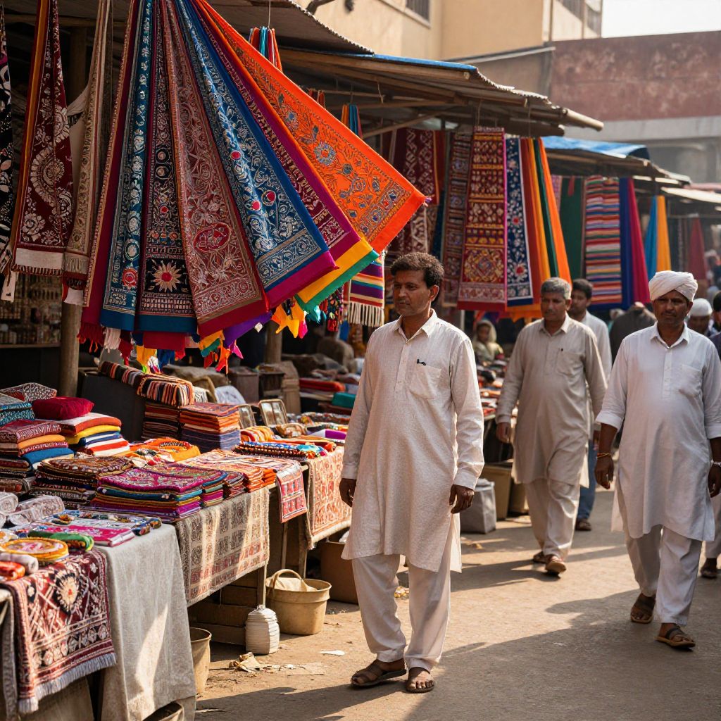 Photograph of a vibrant outdoor market stall. Three South Asian men in white traditional kurta and shalwar walk past colorful textiles hanging overhead. The stall displays an array of intricately patterned fabrics, including bright red, blue, and orange pieces with detailed embroidery. Tables below showcase neatly folded textiles. The men wear white caps, and the background includes other market stalls and sunlight casting shadows on the ground. The market atmosphere is bustling and lively, with a mix of textures and colors enhancing the scene.