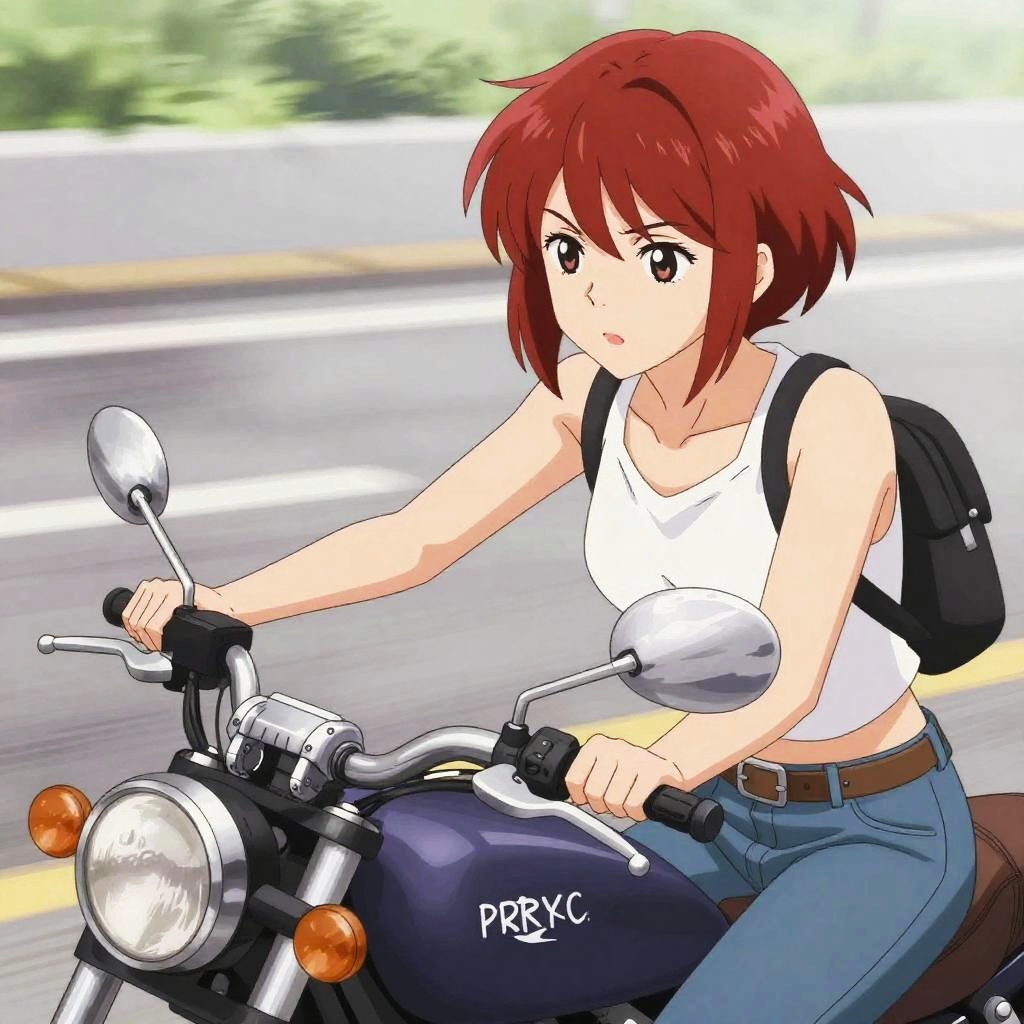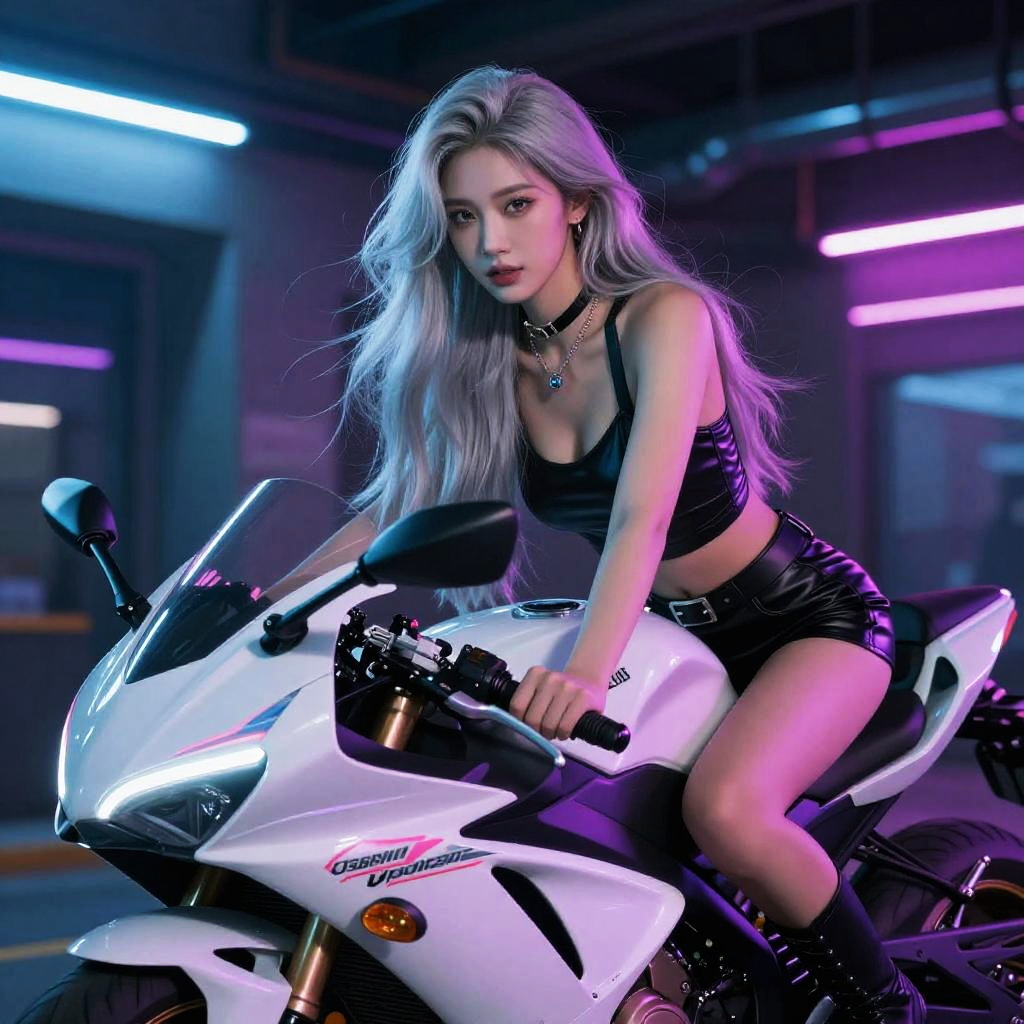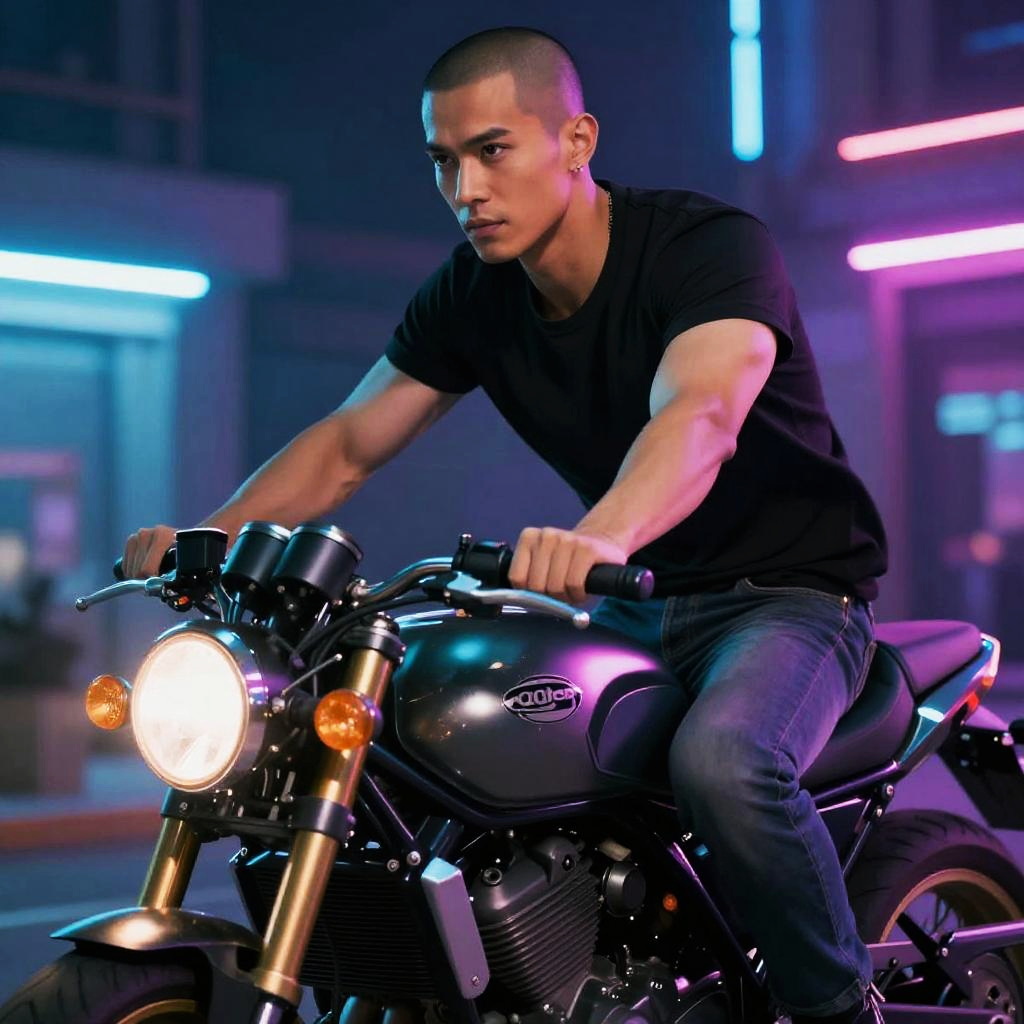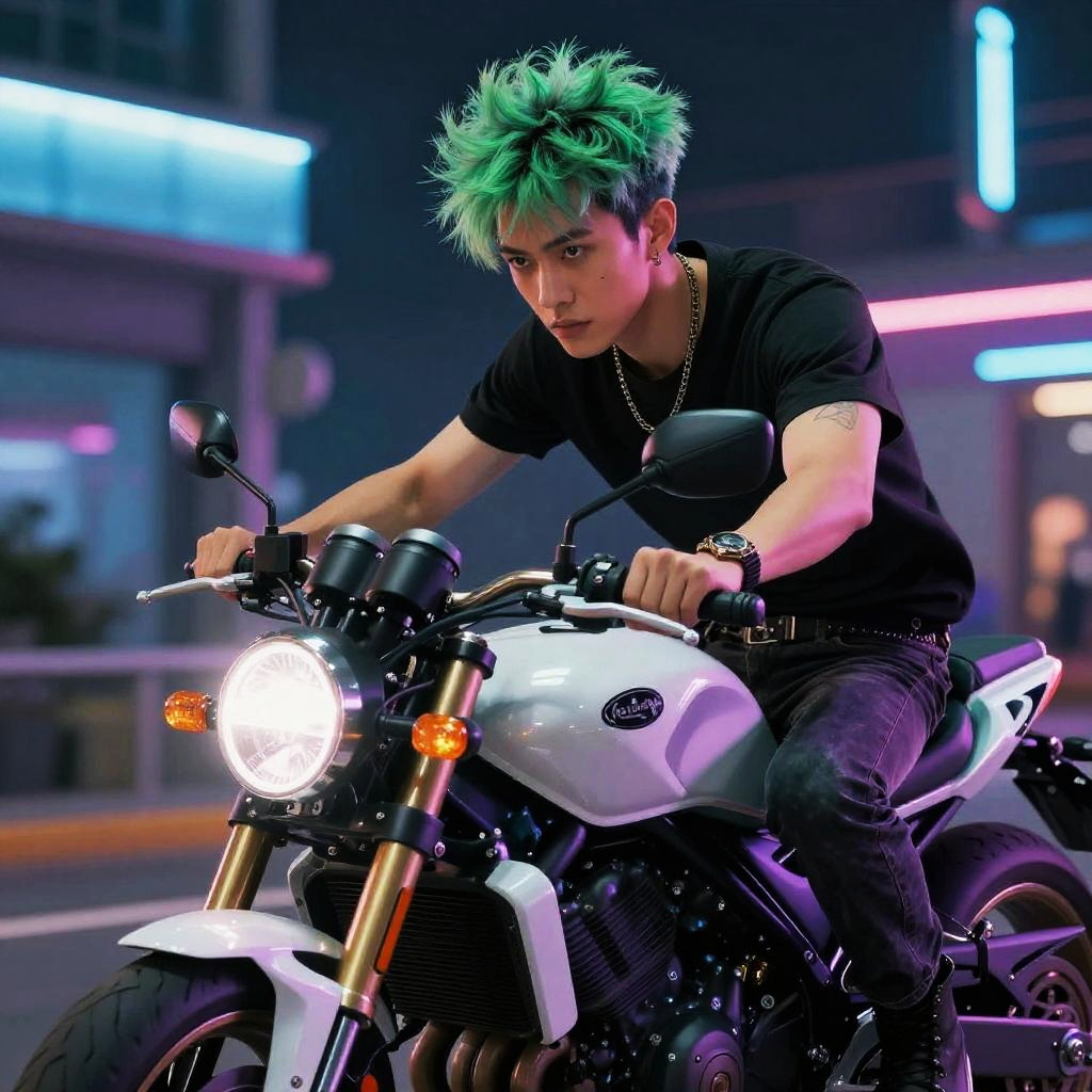 A beautiful man with spiky green hair riding a motorcycle, Synthwave-inspired.