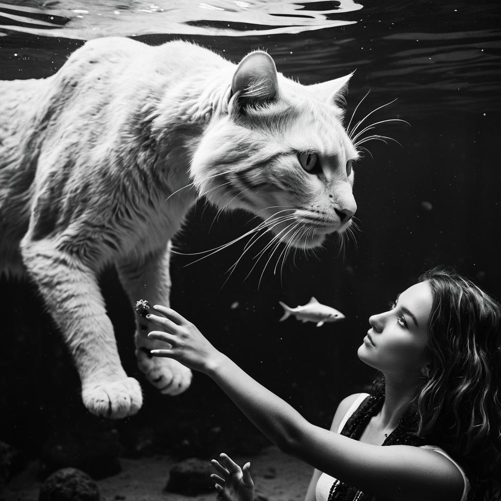 POV shot black and white collodion photography, futuristic luxury. Brutalism underwater, prehistoric animals are feeding an Italian young humanoid man. An Italian young humanoid man is very pregnant with a giant white rabbit. A surreal, perfectly cinematic frame. Very shallow depth of field. Collodion technique. Super realistic details. IMAX.