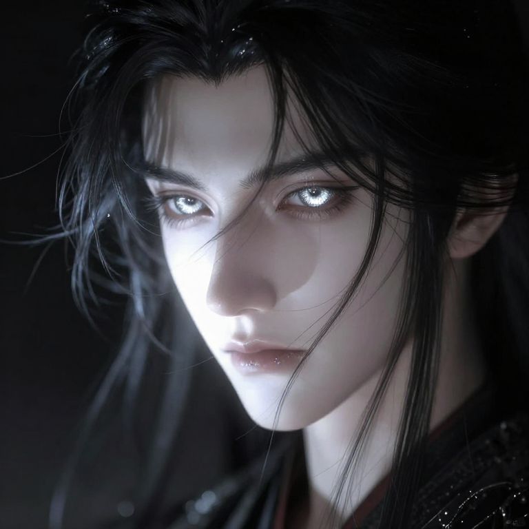 Black hair silver eyes portrait of a mysterious character, ethereal glow, soft shadows, fantasy style, intricate details, subtle metallic highlights in eyes, flowing hair, dark background contrasted with luminous silver pupils